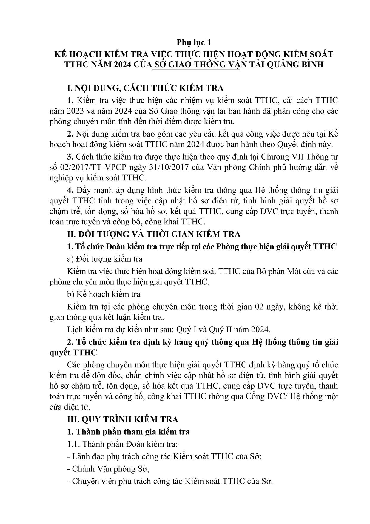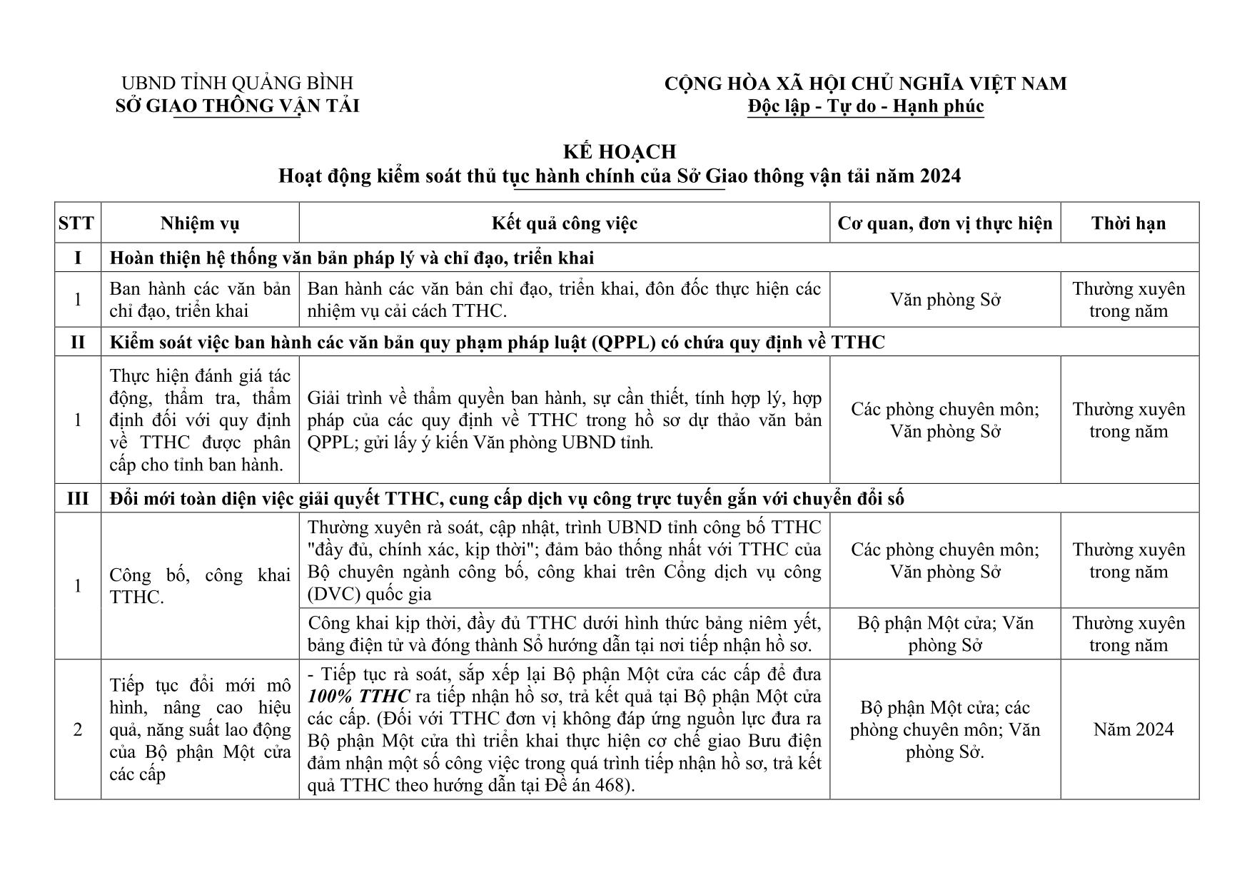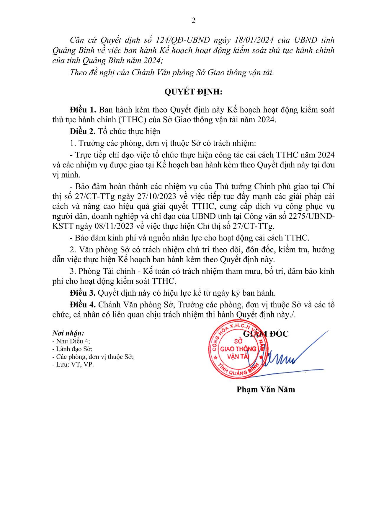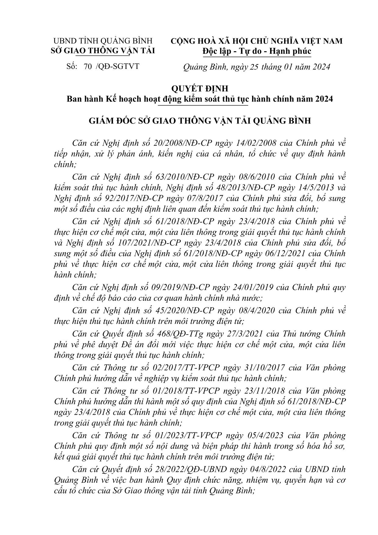 Quyết định ban hành Kế hoạch hoạt động kiểm soát thủ tục hành chính của Sở Giao thông vận tải Quảng Bình năm 2024