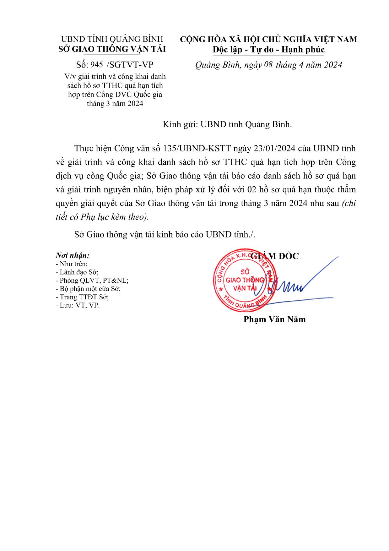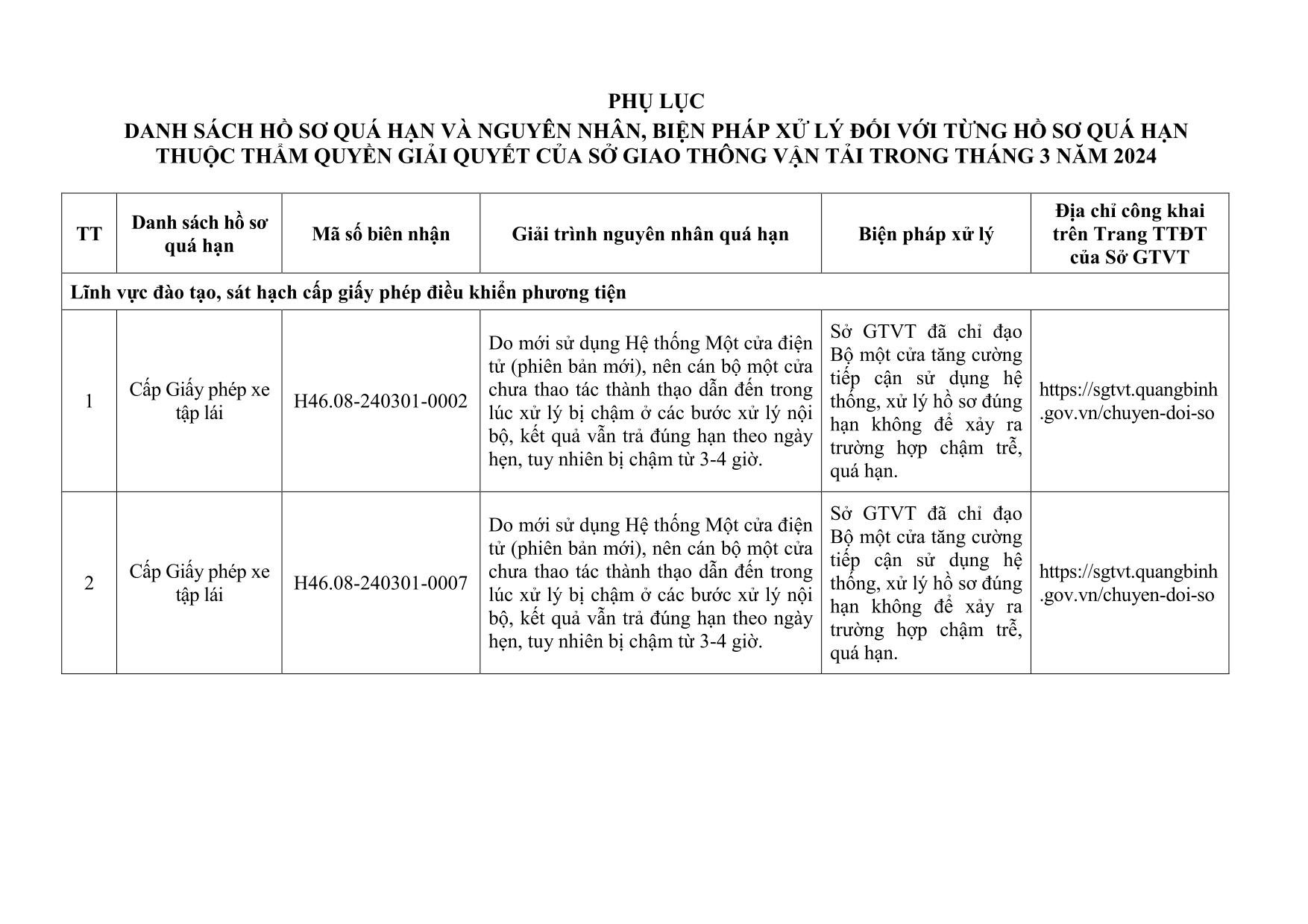 Công khai danh sách hồ sơ TTHC quá hạn thuộc thẩm quyền giải quyết của Sở GTVT trong tháng 03 năm 2024
