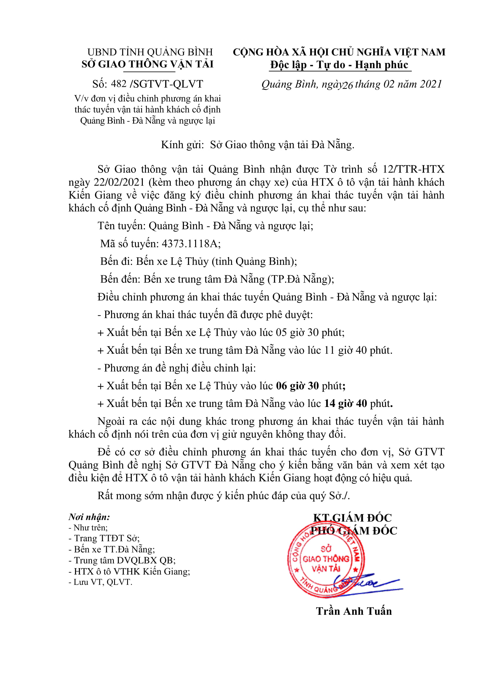 Thông báo Điều chỉnh phương án khai thác tuyến vận tải hành khách cố định của HTX ô tô vận tải hành khách Kiến Giang (Tuyến Quảng Bình - Đà Nẵng và ngược lại)