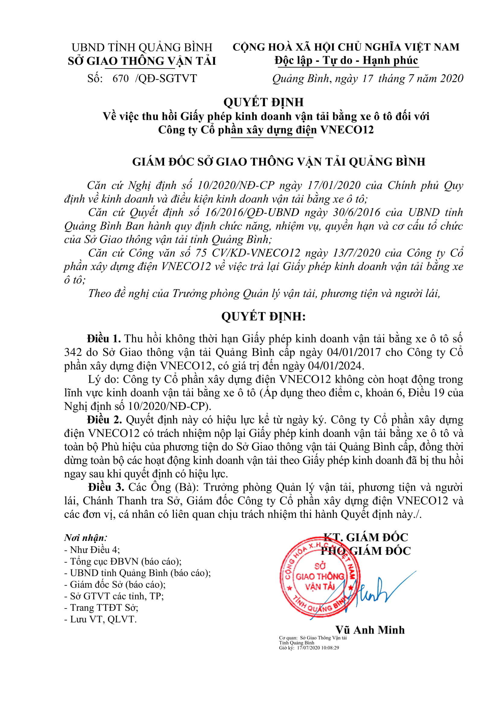 Thu hồi Giấy phép kinh doanh vận tải bằng xe ô tô đối với Công ty Cổ phần xây dựng điện VNECO12