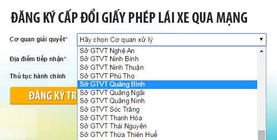 Bước 2: Chọn Cơ quan giải quyết là “Sở GTVT Quảng Bình”