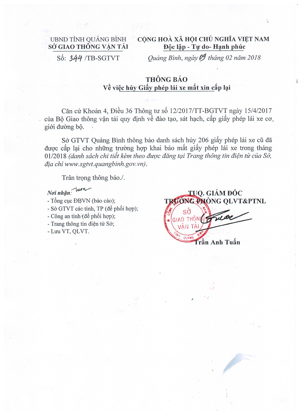 Thông báo về việc hủy Giấy phép lái xe mất xin cấp lại (Tháng 01/2018)