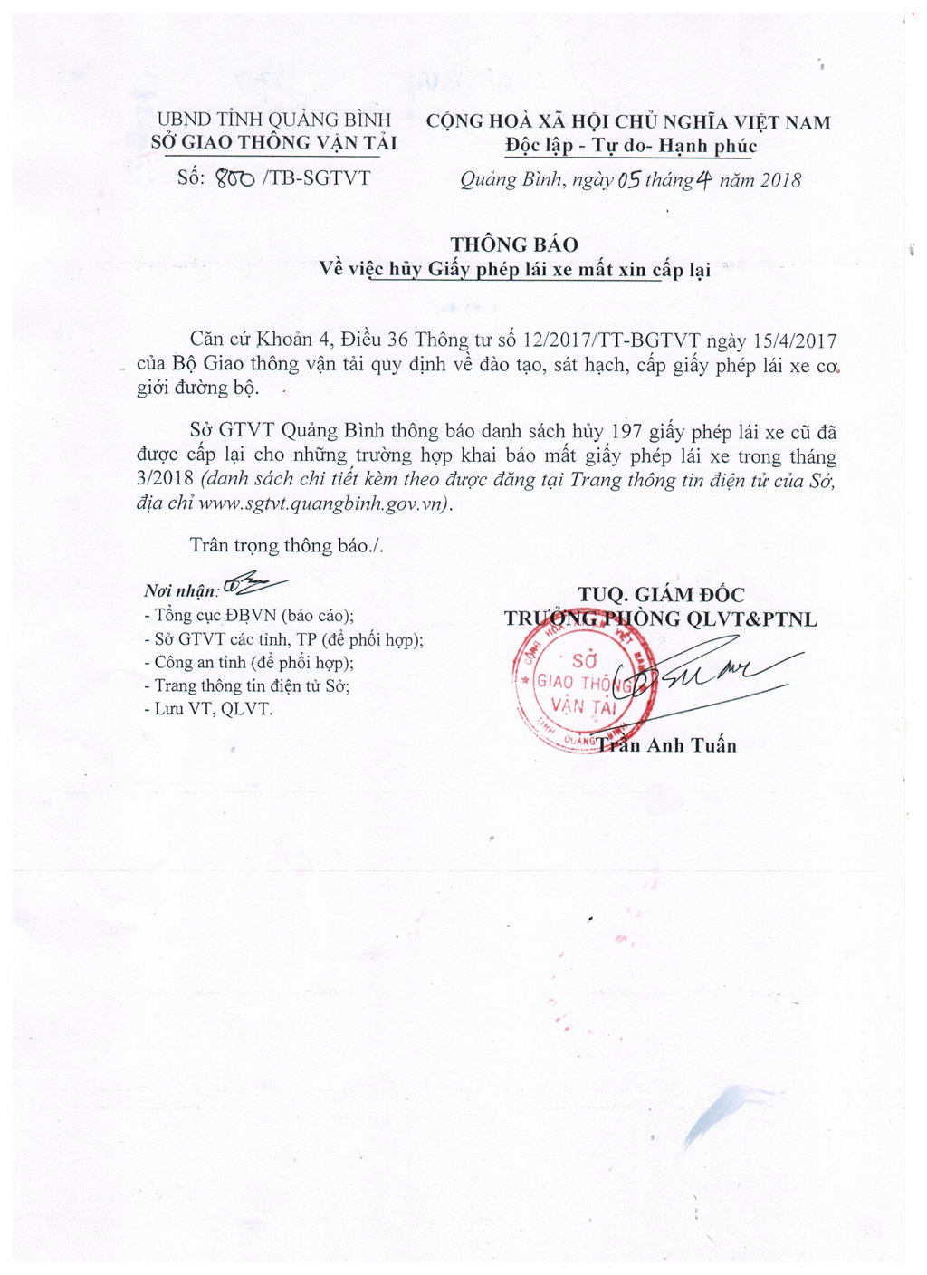 Thông báo về việc hủy Giấy phép lái xe mất xin cấp lại (Tháng 03/2018)