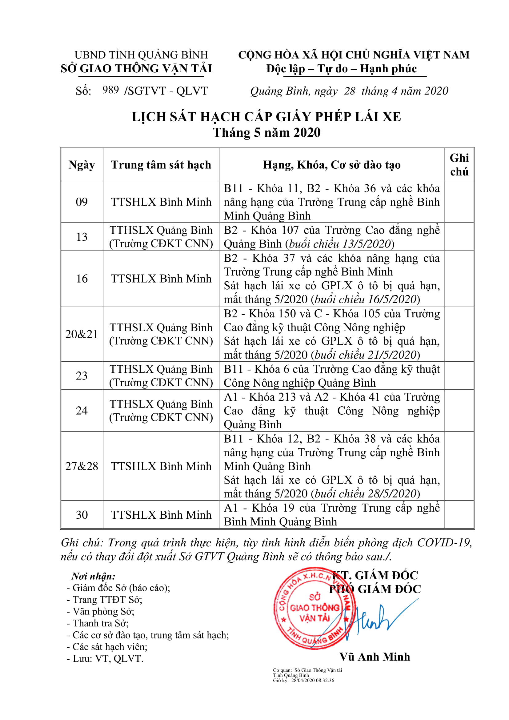 Lịch sát hạch Giấy phép lái xe tháng 05/2020