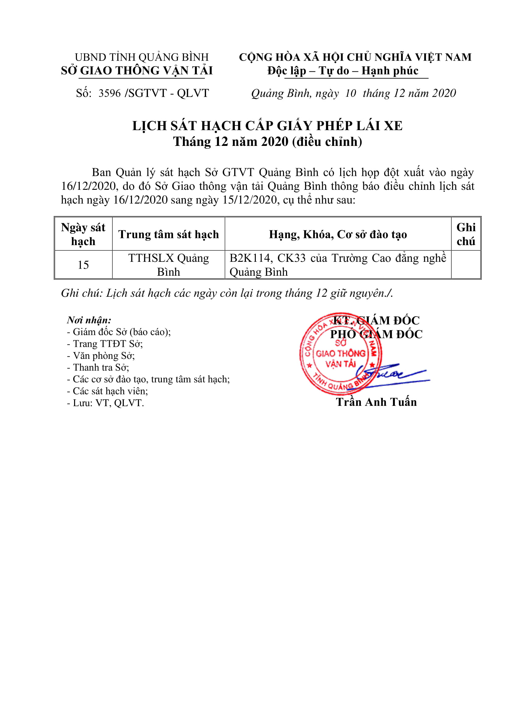 Lịch sát hạch Giấy phép lái xe tháng 12/2020 (Điều chỉnh)