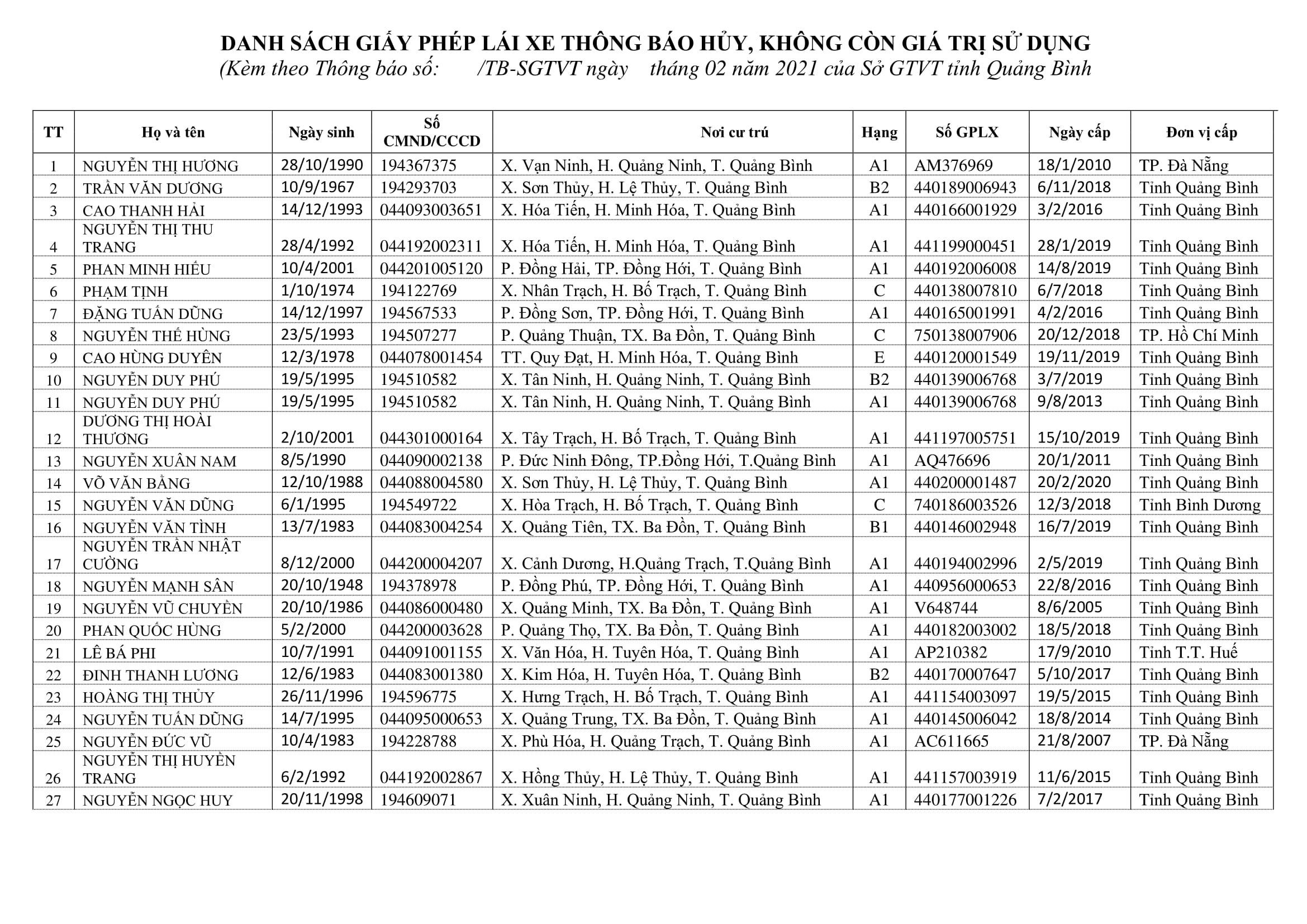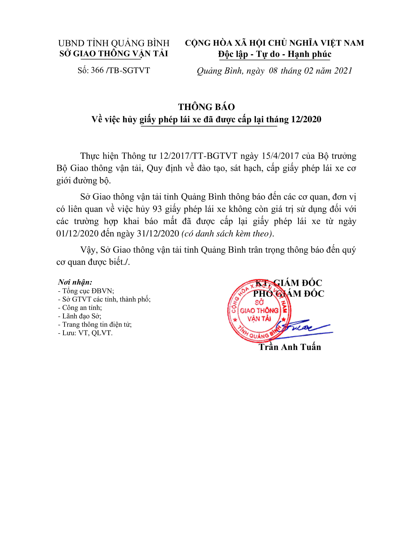Thông báo hủy giấy phép lái xe, đã được cấp lại tháng 12/2020