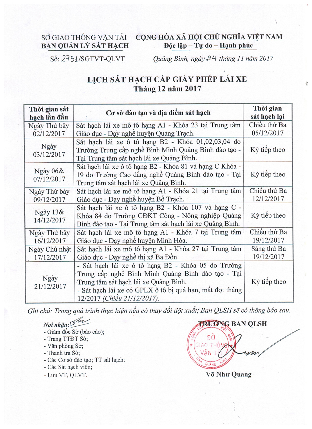 Lịch sát hạch cấp Giấy phép lái xe tháng 12 năm 2017
