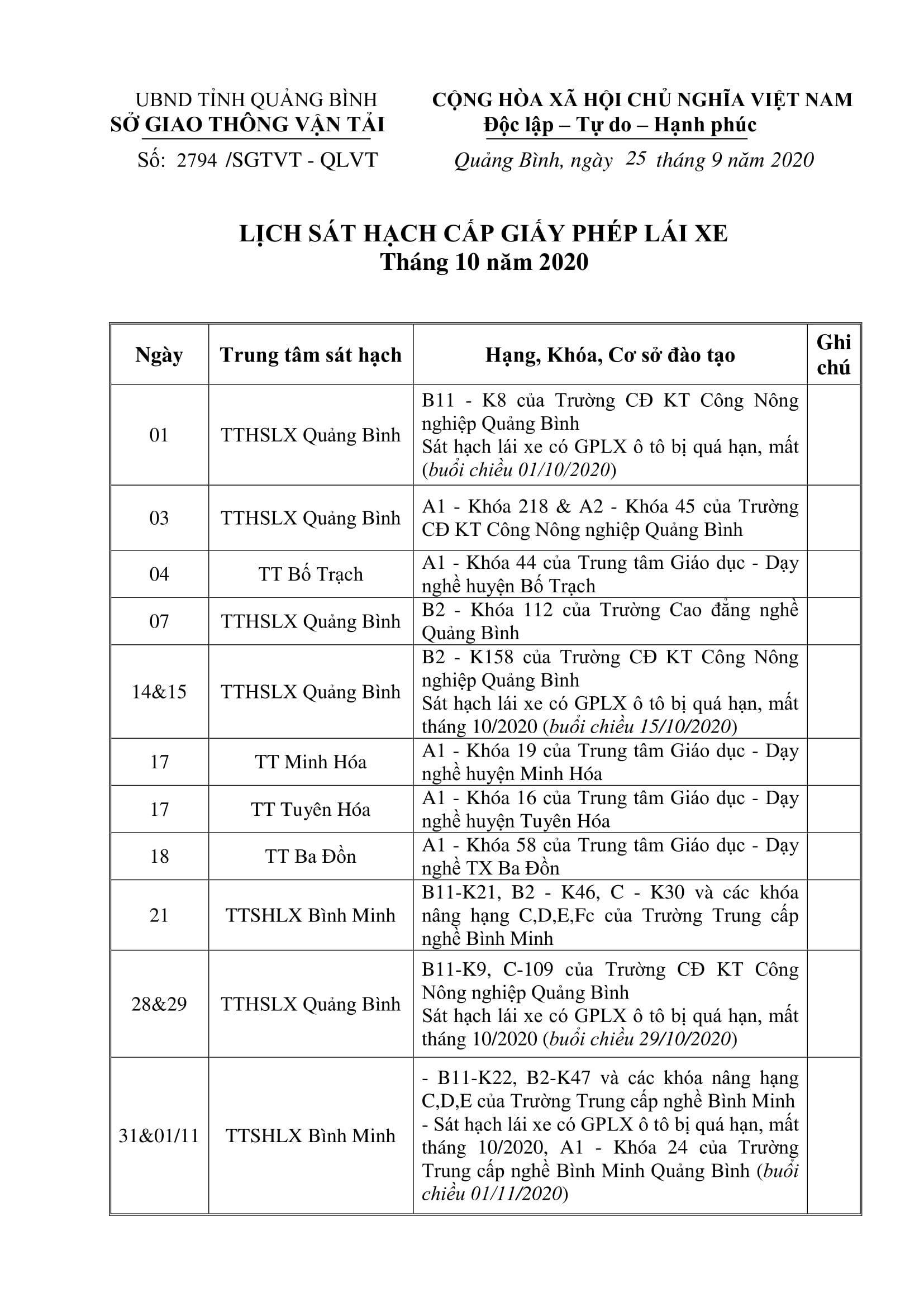 Lịch sát hạch Giấy phép lái xe tháng 10/2020