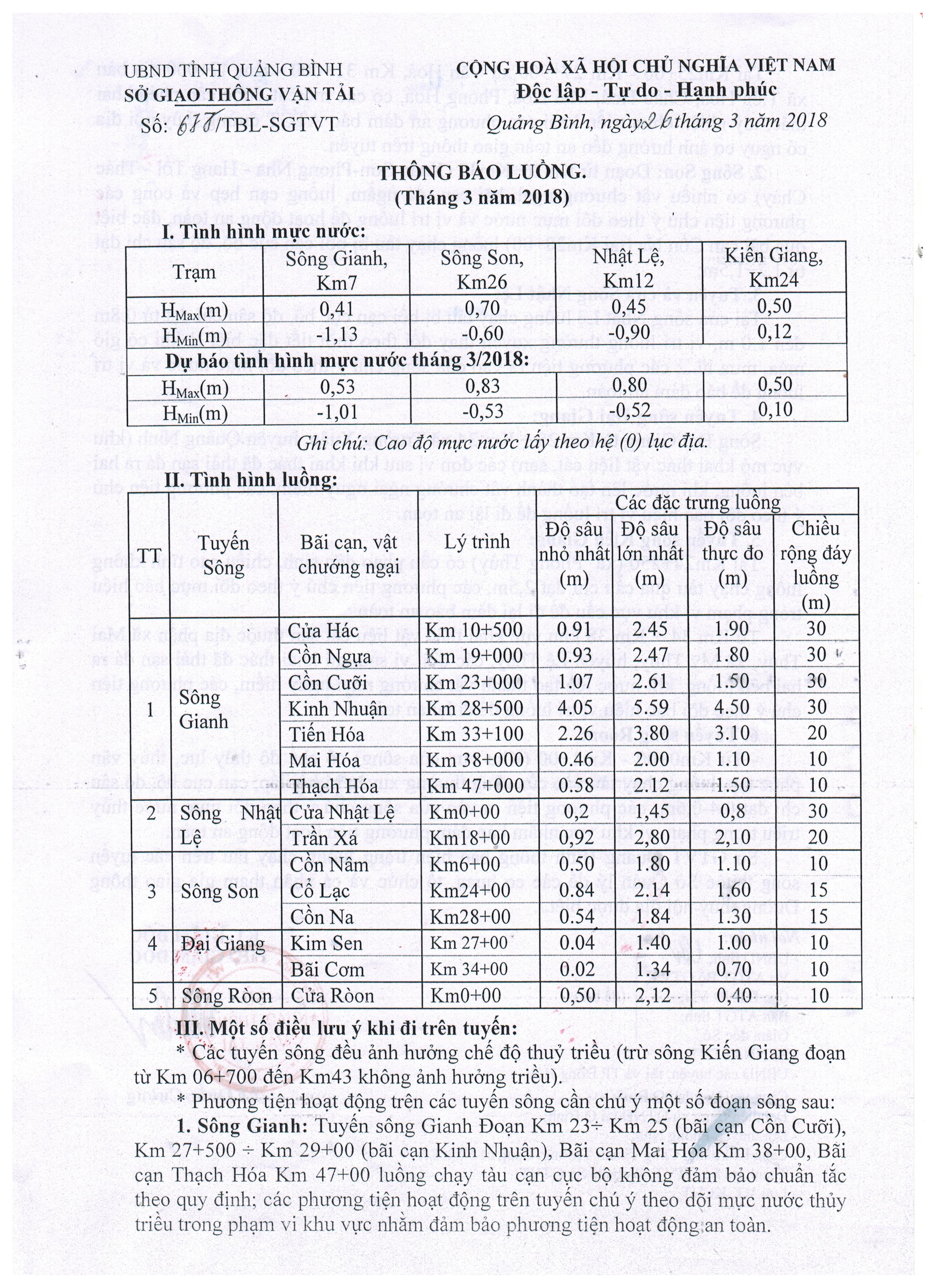 Thông báo luồng Đường thủy nội địa tháng 03/2018