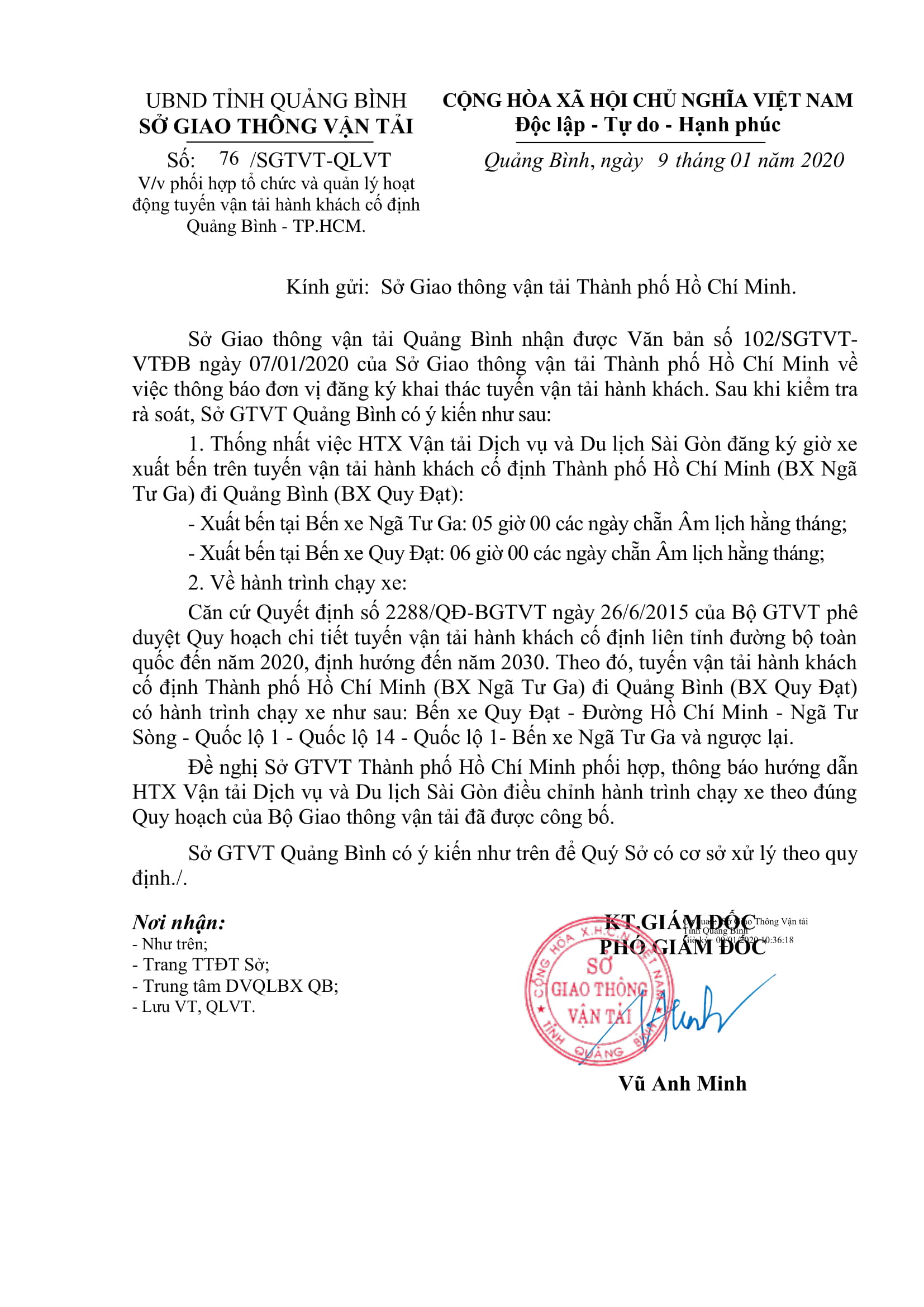 - Thông báo Điều chỉnh phương án khai thác tuyến vận tải hành khách cố định của HTX vận tải Phú Thành Tuyên Minh (Tuyến Quảng Bình - Hà Nội và ngược lại) (27/12/2019)
