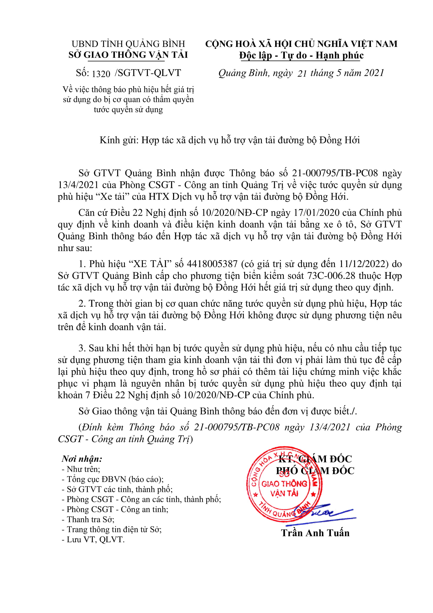 Thông báo Phù hiệu xe 73C00628 của HTX Đồng Hới hết giá trị sử dụng do bị cơ quan có thẩm quyền tước quyền sử dụng