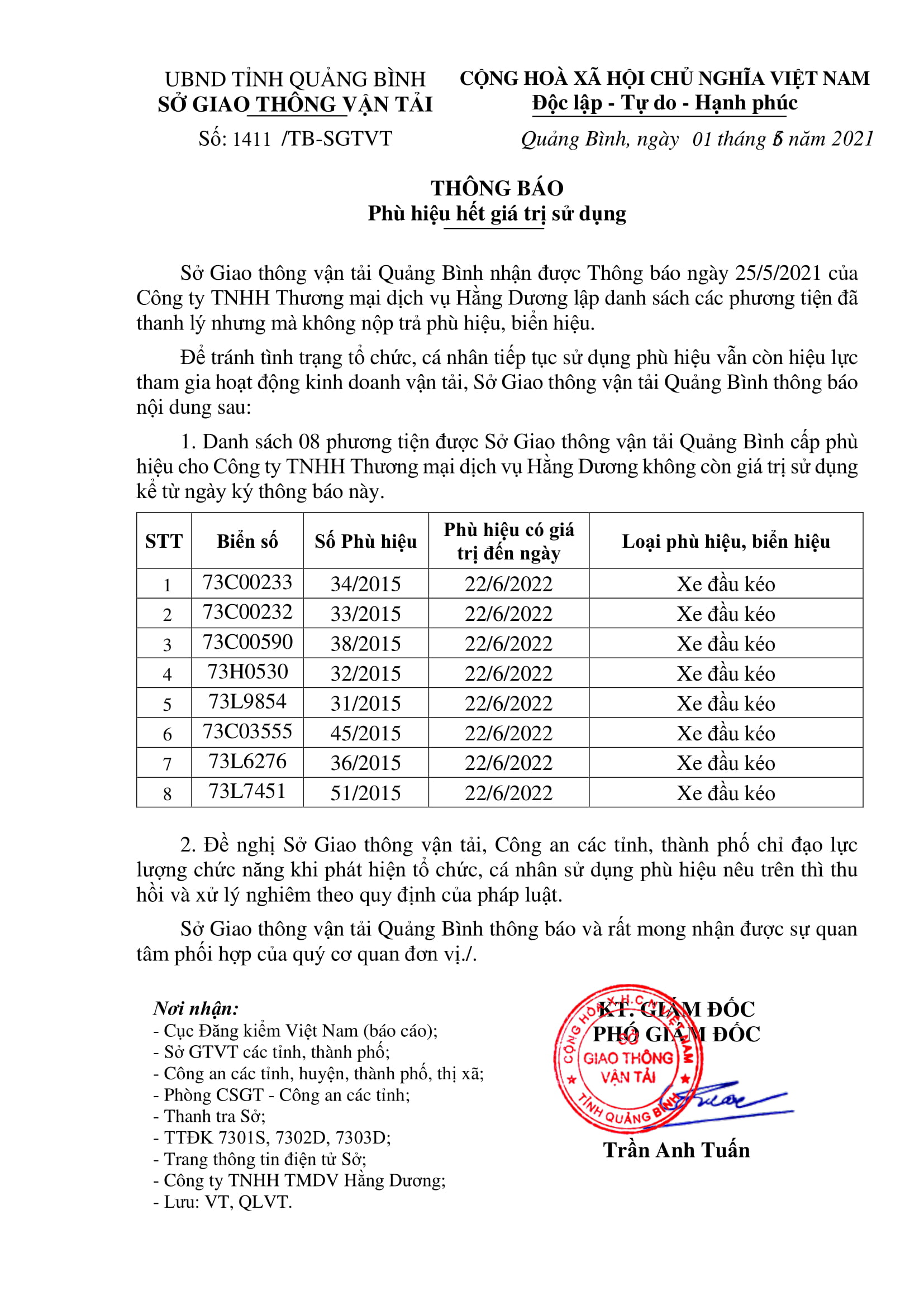 - Thông báo Phù hiệu xe 73C10777 của HTX Hải Anh hết giá trị sử dụng do bị cơ quan có thẩm quyền tước quyền sử dụng (25/05/2021)