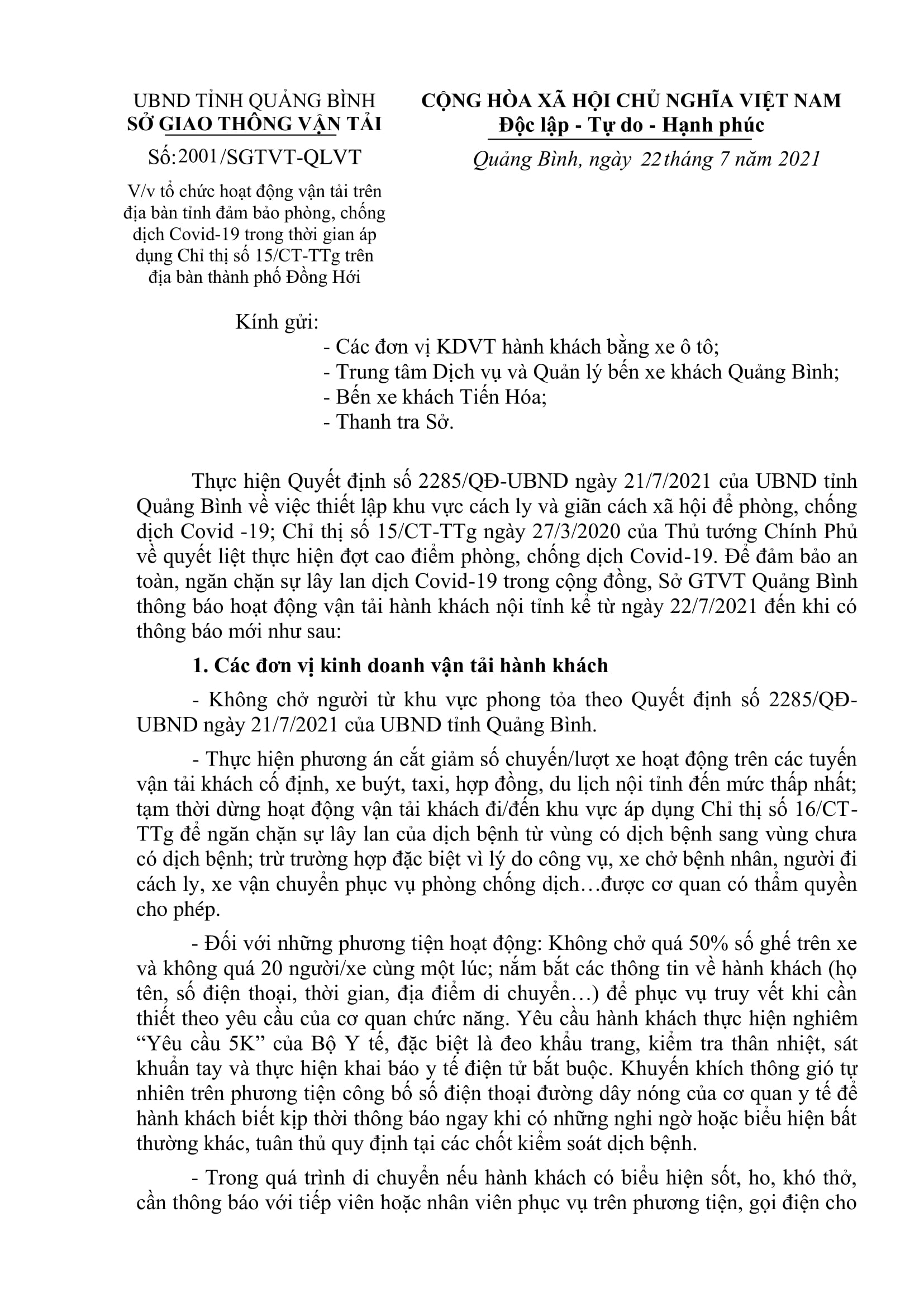 - Thông báo dừng hoạt động vận tải hành khách đi/đến địa bàn huyện Minh Hóa, tỉnh Quảng Bình (21/07/2021)