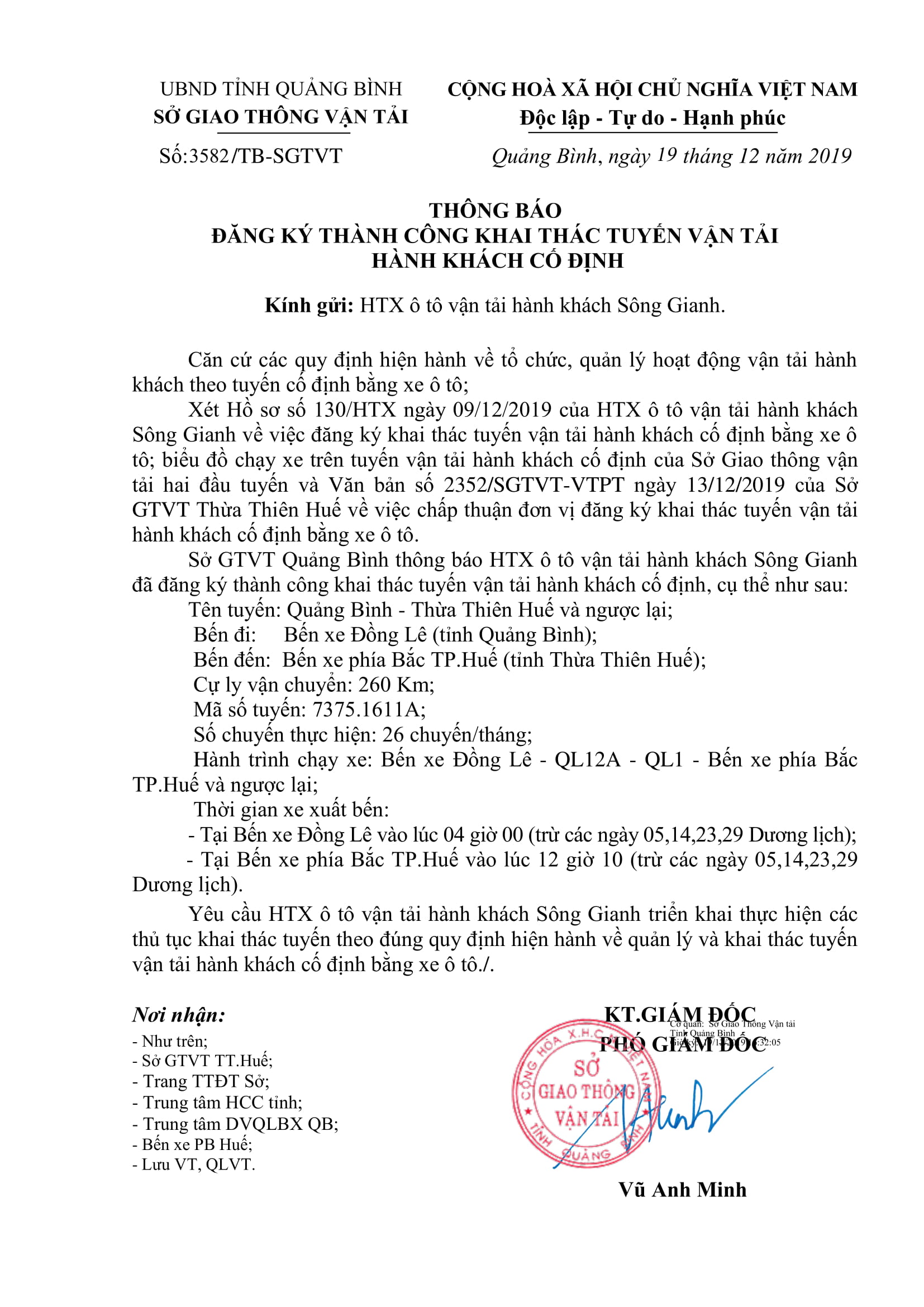- Thông báo Đăng ký khai thác tuyến vận tải hành khách cố định của HTX ô tô vận tải hành khách sông Gianh (tuyến Quảng Bình - Thừa Thiên Huế và ngược lại) (27/12/2019)