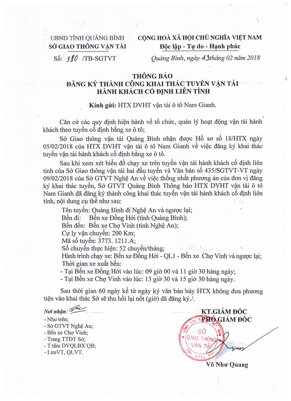 - Thông báo Đăng ký khai thác tuyến vận tải hành khách cố định liên tỉnh của HTX DVHT vận tải ô tô Nam Gianh (tuyến Quảng Bình - Nghệ An và ngược lại) (07/02/2018)