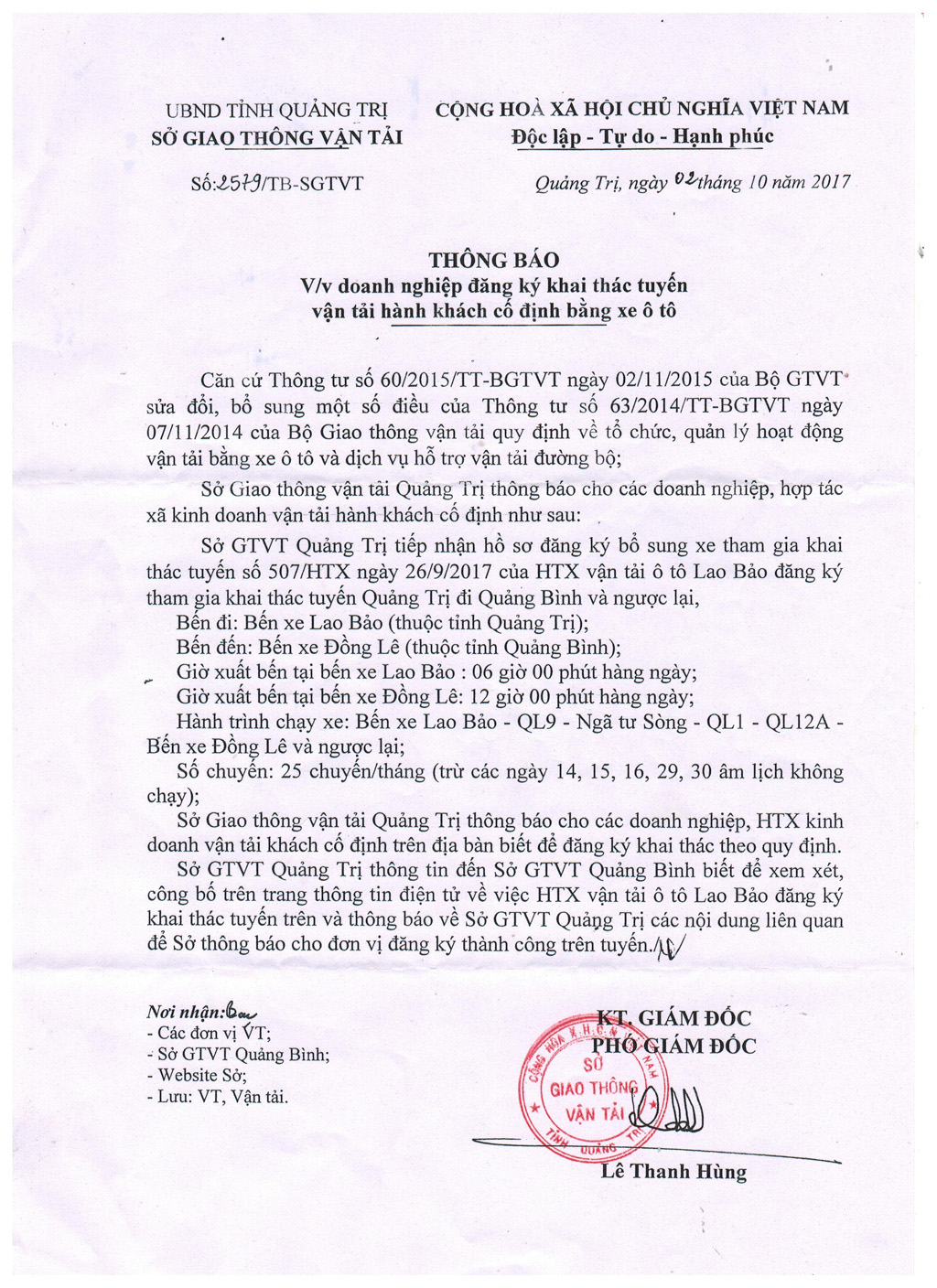 Thông báo về việc Doanh nghiệp đăng ký khai thác tuyến vận tải hành khách cố định bằng xe ô tô