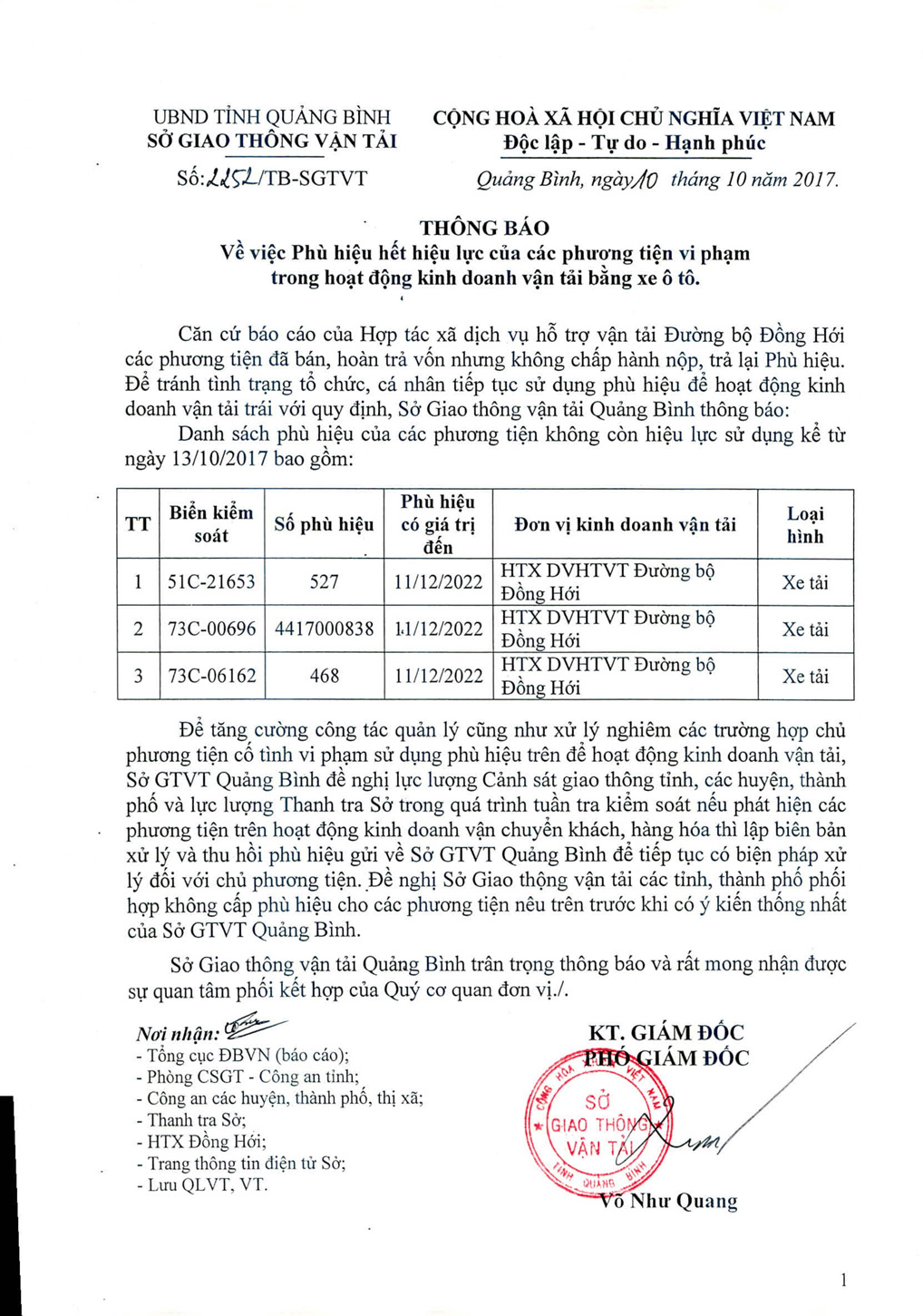 Thông báo về việc Phù hiệu hết hiệu lực của các phương tiện vi phạm trong hoạt động kinh doanh vận tải bằng xe ô tô