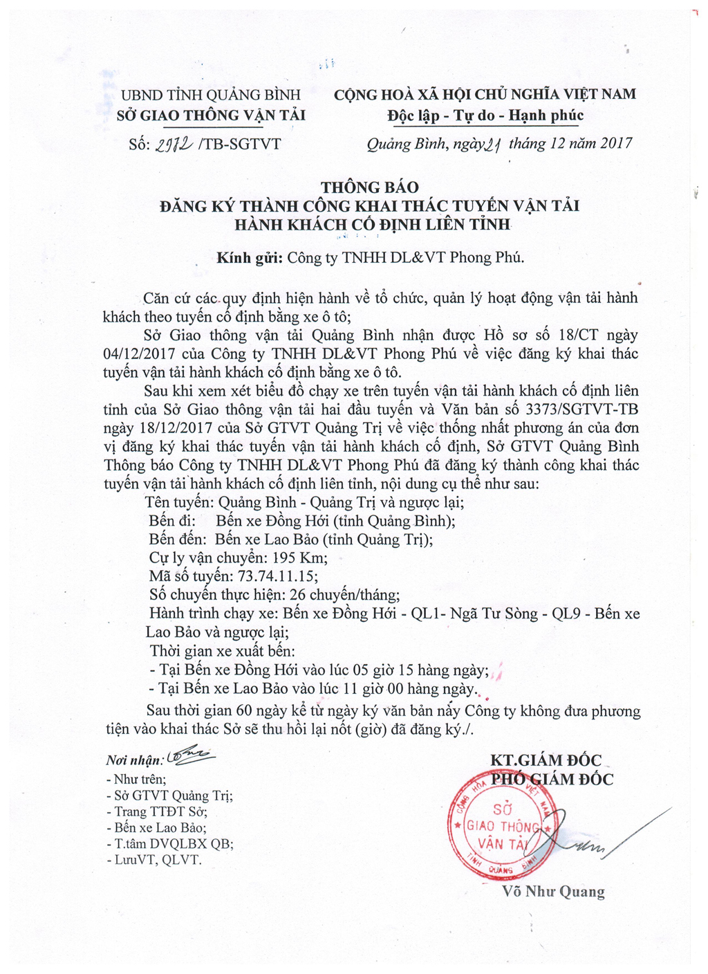 Thông báo Đăng ký thành công khai thác tuyến vận tải hành khách cố định liên tỉnh của Công ty TNHH DL&VT Phong Phú (tuyến Quảng Bình - Quảng Trị và ngược lại)
