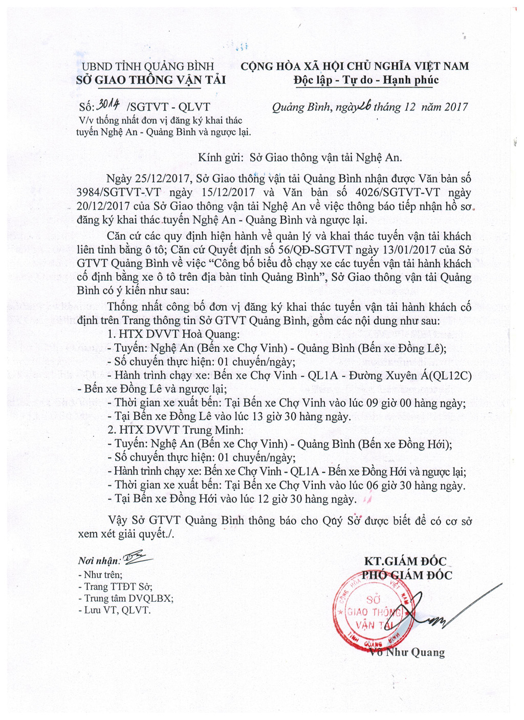 V/v thống nhất đơn vị đăng ký khai thác tuyến Nghệ An - Quảng Bình và ngược lại