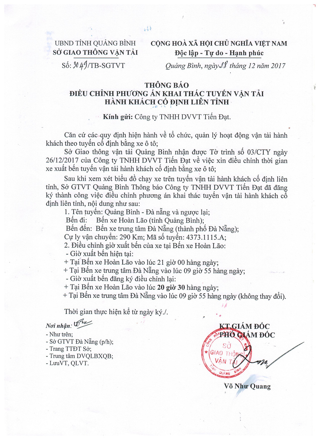 Thông báo Điều chỉnh phương án khai thác tuyến vận tải hành khách cố định liên tỉnh của Công ty TNHH DVVT Tiến Đạt (Tuyến Quảng Bình - Thừa Thiên Huế và ngược lại)