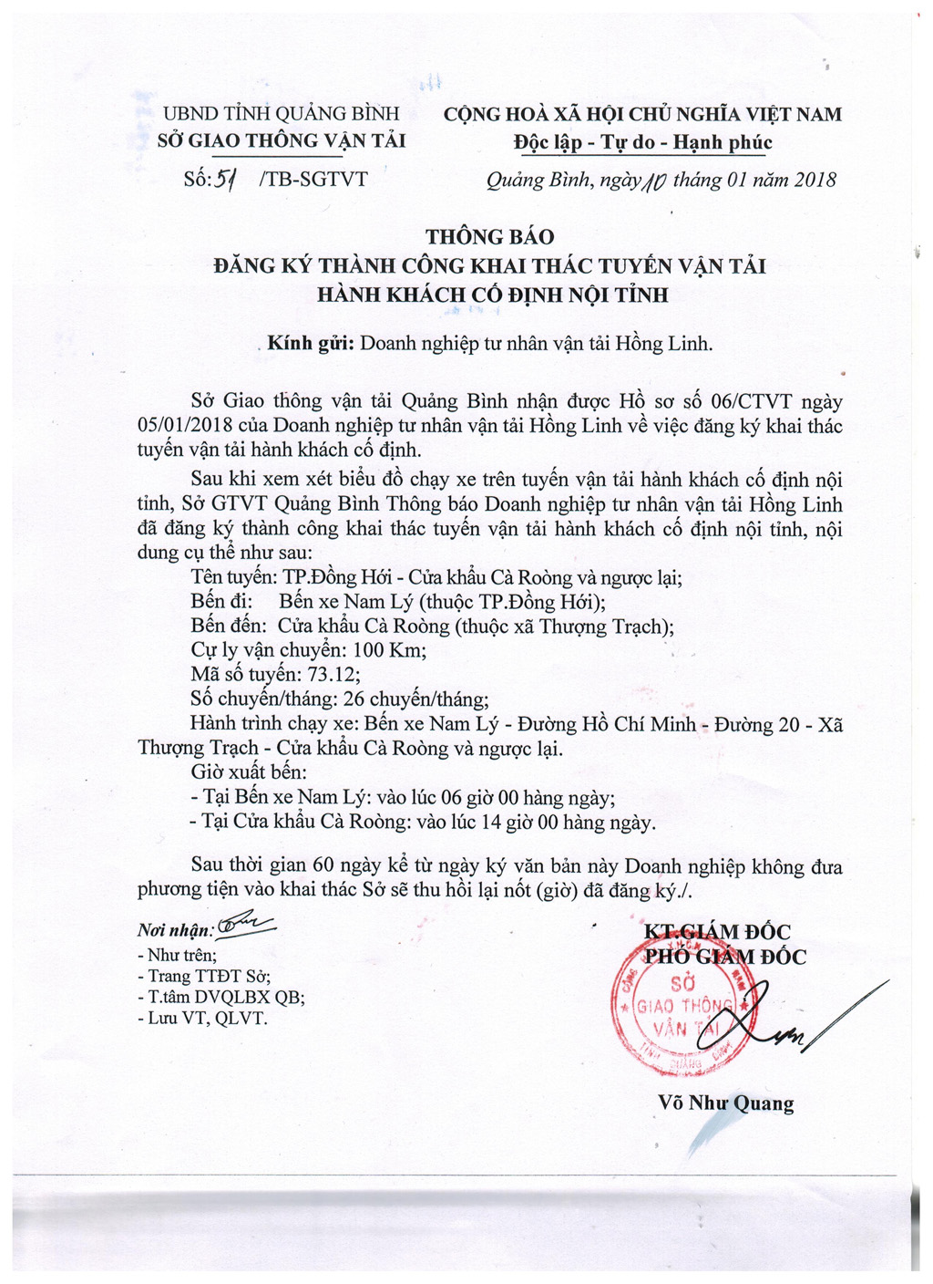 - Thông báo Đăng ký thành công khai thác tuyến vận tải hành khách cố định liên tỉnh của Công ty TNHH DL&VT Phong Phú (tuyến Quảng Bình - Quảng Trị và ngược lại) (26/12/2017)