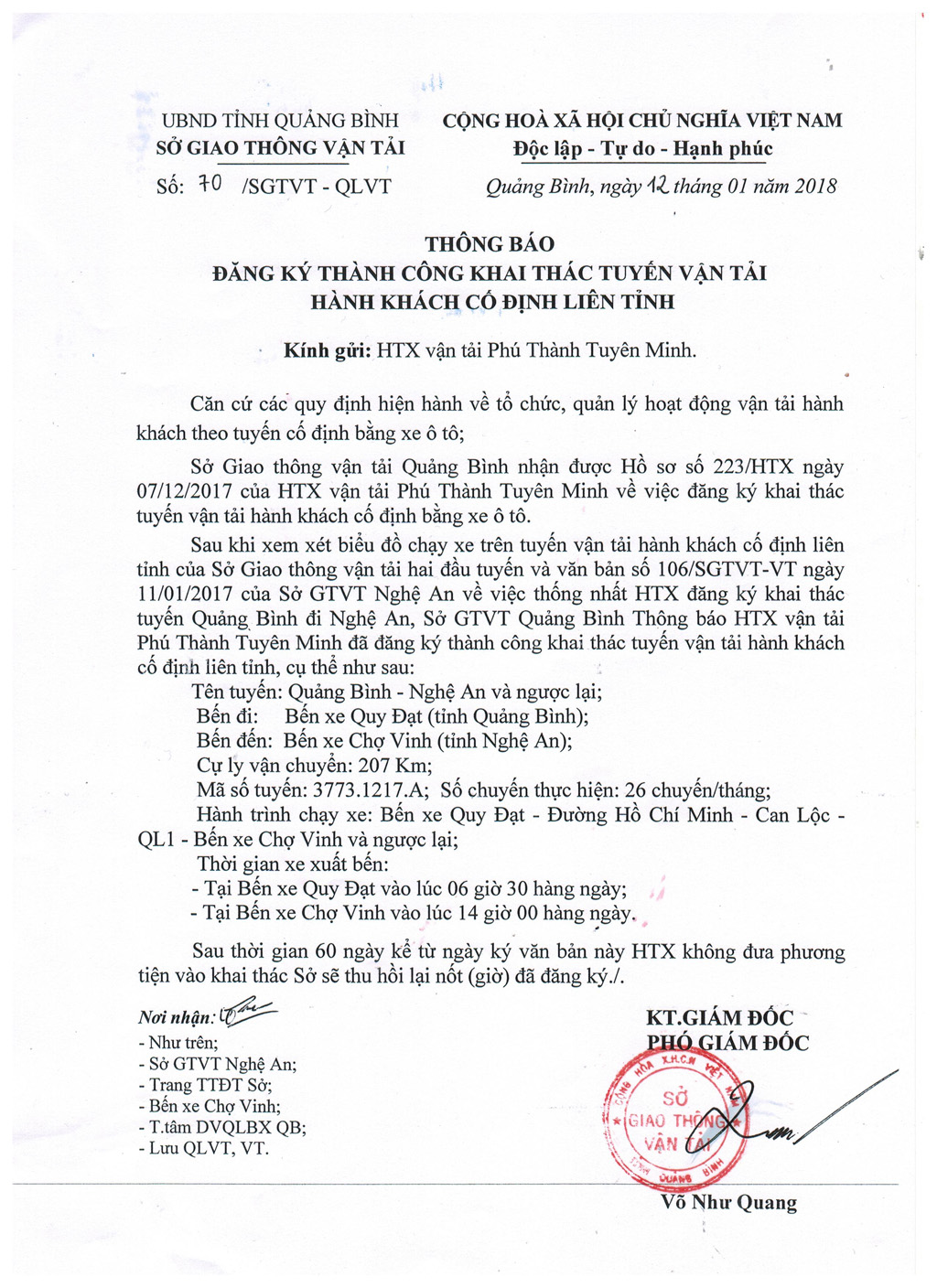 - V/v thống nhất đơn vị đăng ký khai thác tuyến Nghệ An - Quảng Bình và ngược lại (26/12/2017)