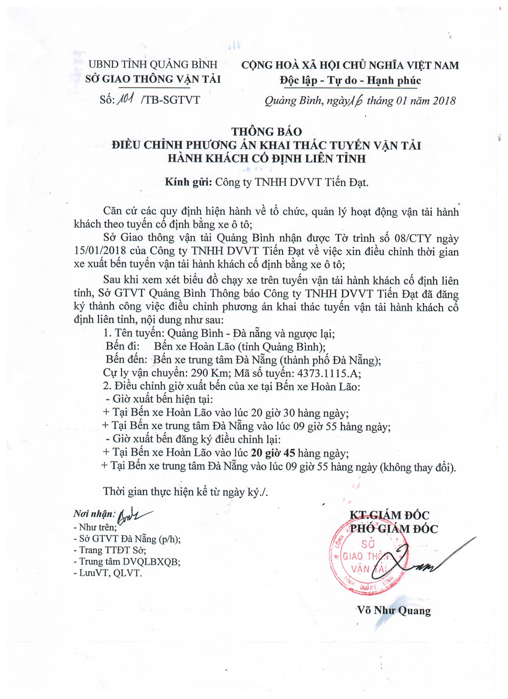 Thông báo Điều chỉnh phương án khai thác tuyến vận tải hành khách cố định liên tỉnh của Công ty TNHH DVVT Tiến Đạt (Tuyến Quảng Bình - Đà Nẵng và ngược lại)