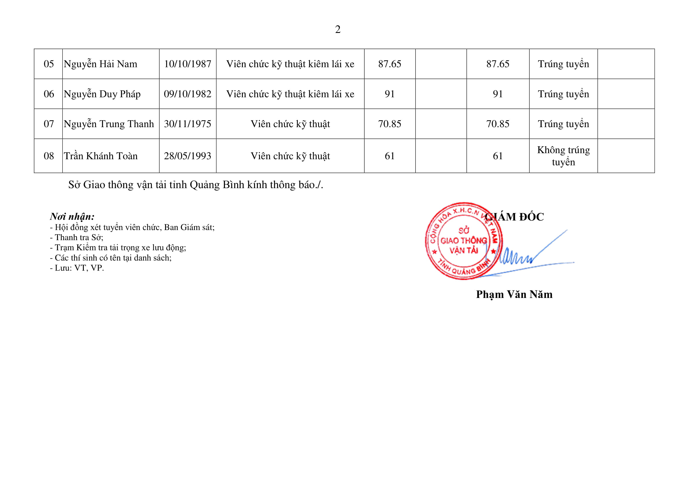 Thông báo kết quả xét tuyển viên chức vào làm việc tại Trạm kiểm tra tải trọng xe lưu động trực thuộc Thanh tra Sở Giao thông vận tải tỉnh Quảng Bình