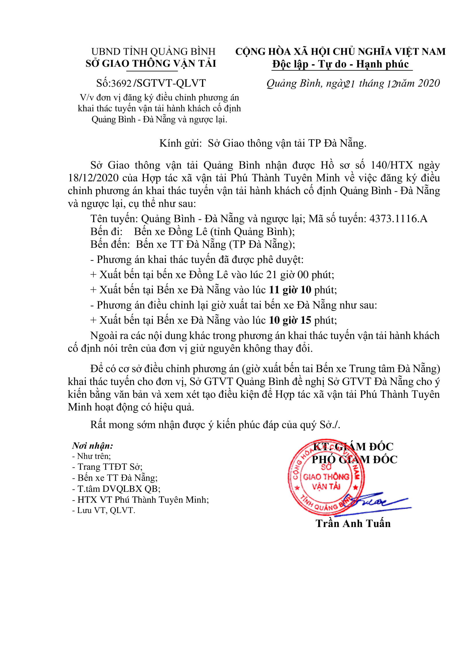 thông báo Điều chỉnh phương án khai thác tuyến vận tải hành khách cố định của Hợp tác xã vận tải Phú Thành Tuyên Minh (Tuyến Quảng Bình - Đà Nẵng và ngược lại)