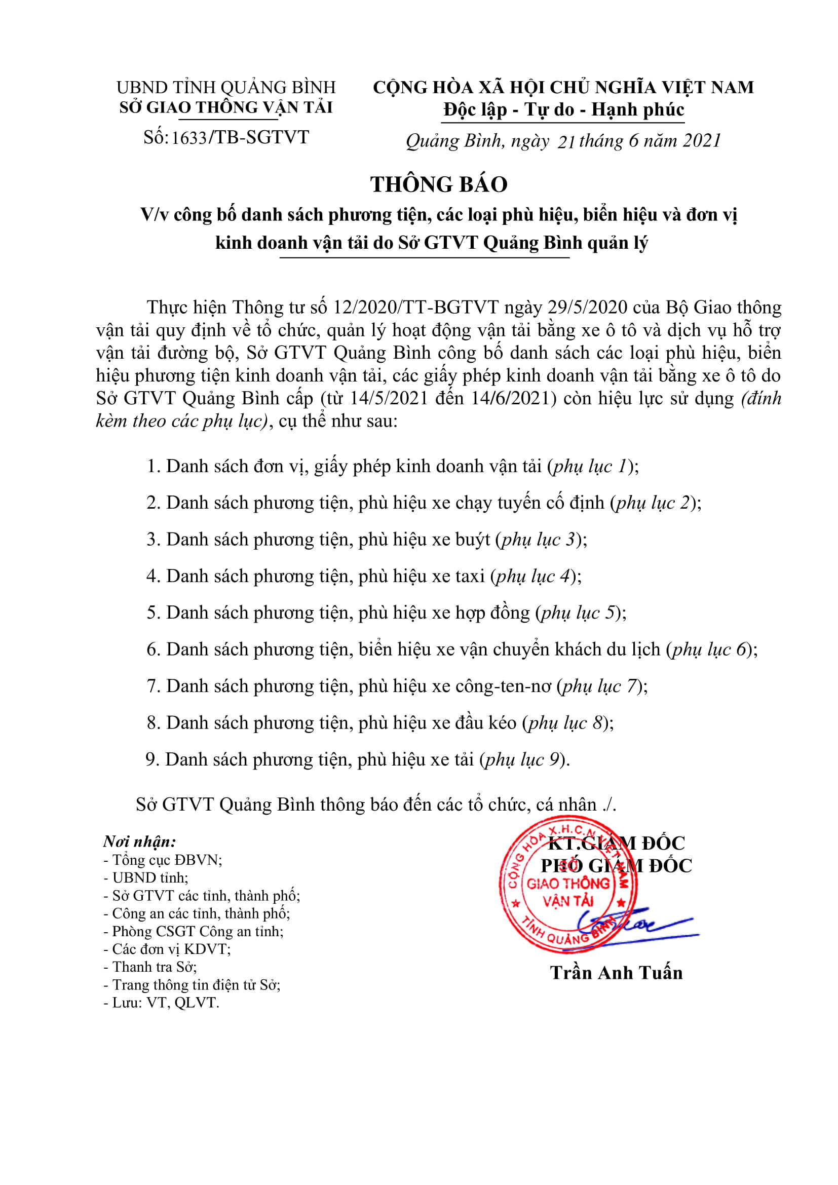 - Thông báo Phù hiệu xe 73C-086.60 của HTX Vận tải hành khách Hải Anh hết giá trị sử dụng do bị cơ quan có thẩm quyền tước quyền sử dụng