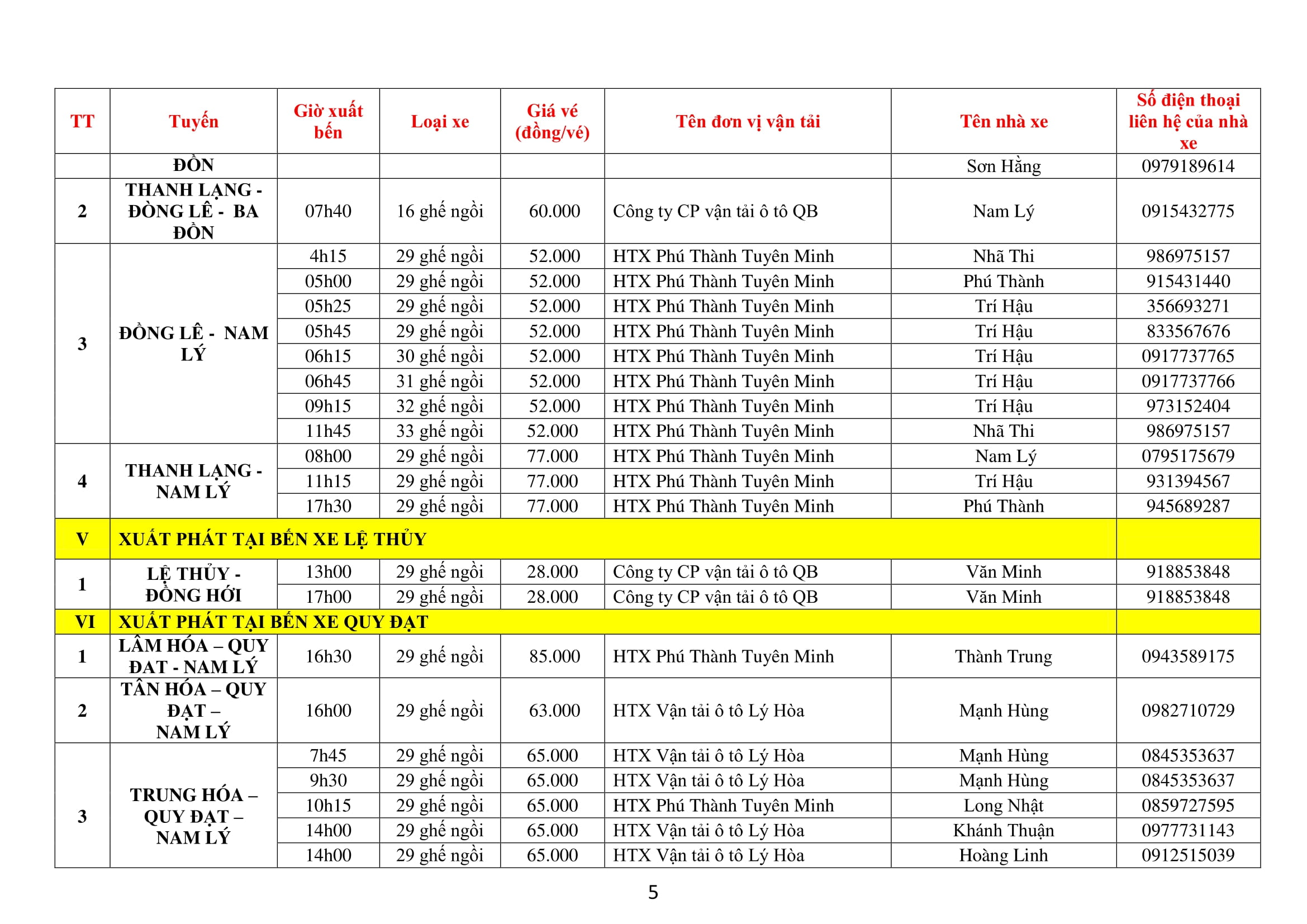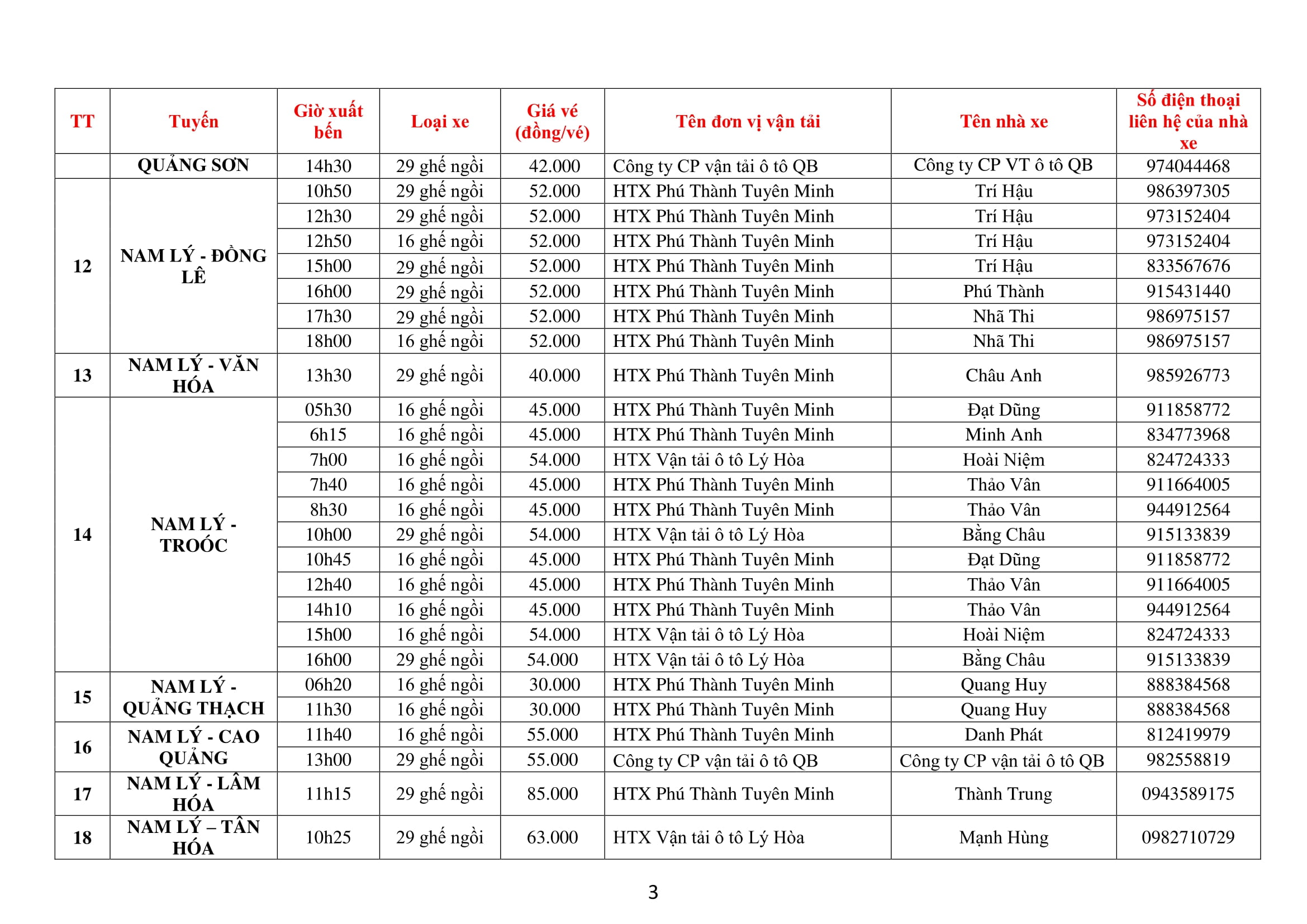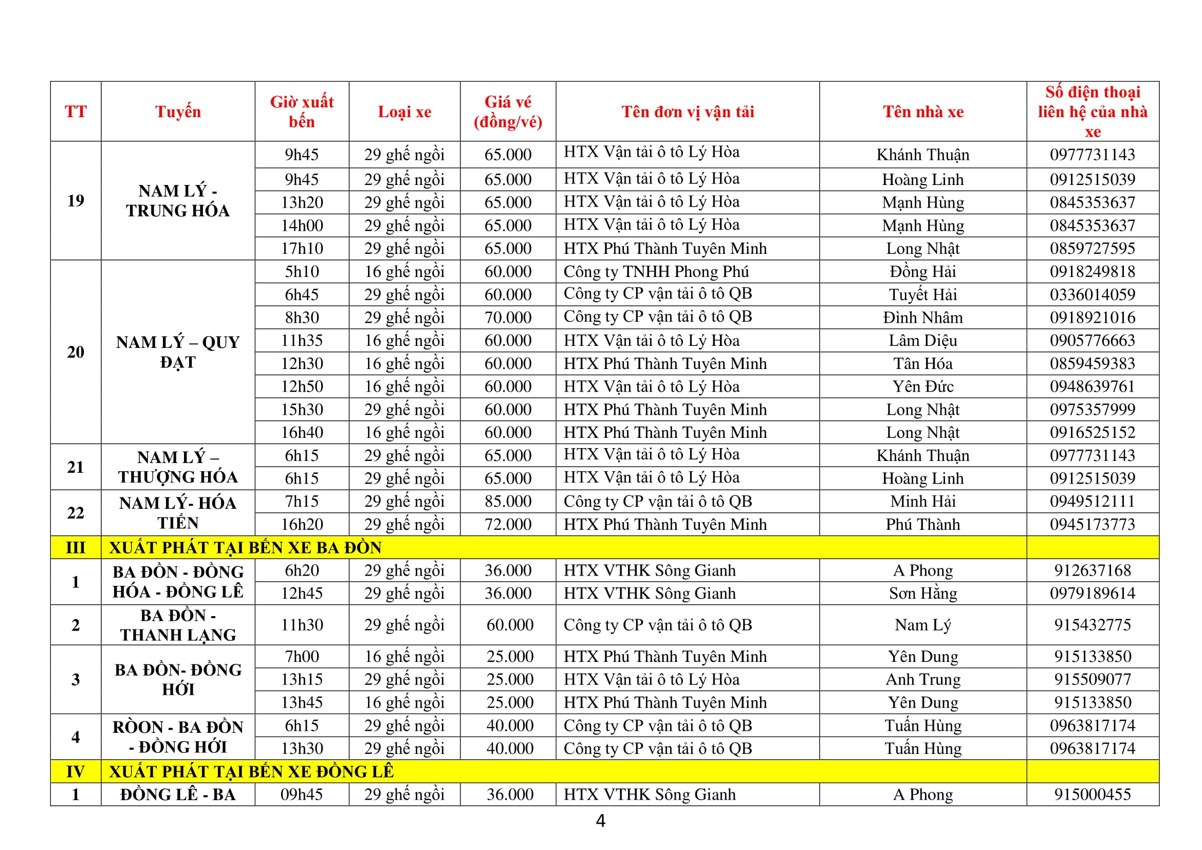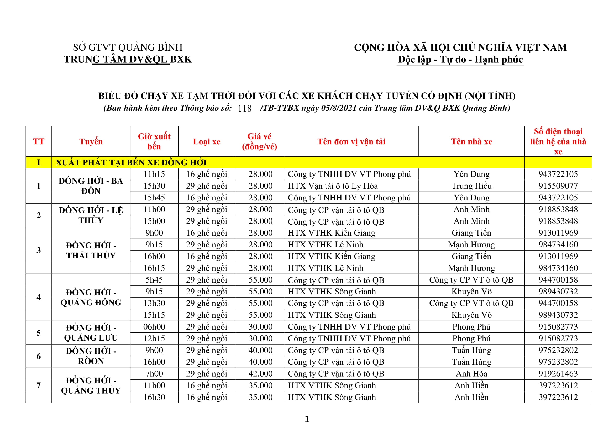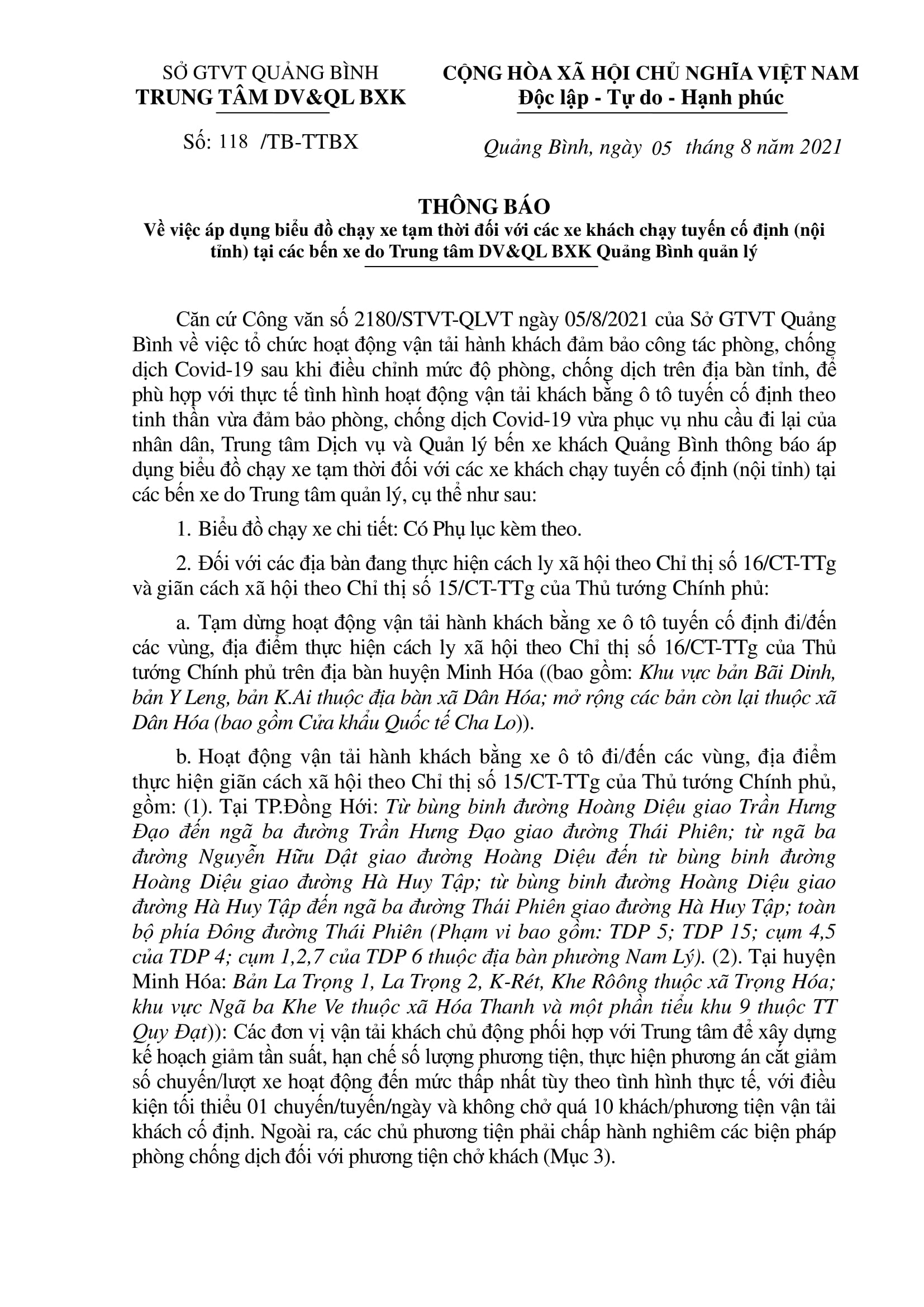 Thông báo áp dụng biểu đồ chạy xe tạm thời đối với các xe khách chạy tuyến cố định (nội tỉnh) tại các bến do Trung tâm Dịch vụ và quản lý bến xe khách Quảng Bình quản lý