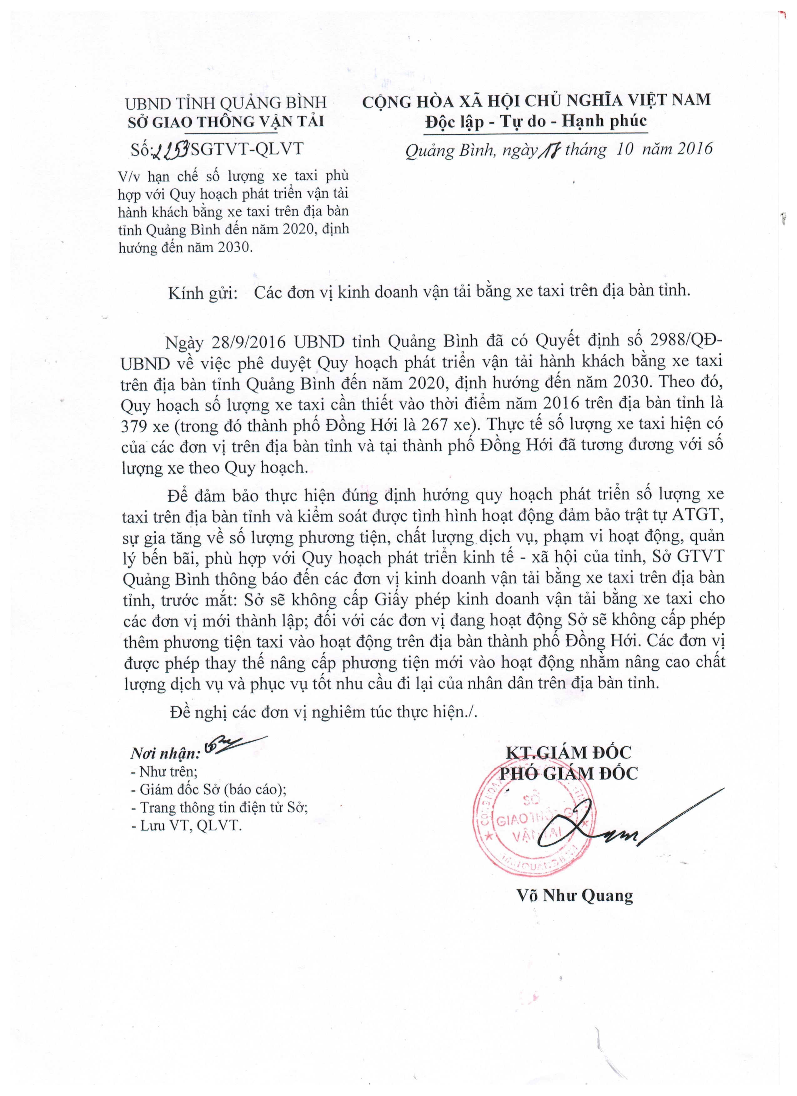Thông báo về việc hạn chế số lượng xe taxi phù hợp với Quy hoạch phát triển vận tải hành khách bằng xe taxi trên địa bàn tỉnh Quảng Bình đến năm 2020, định hướng đến năm 2030