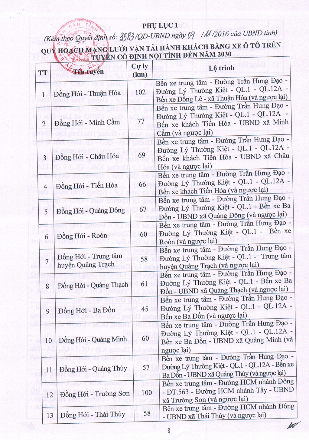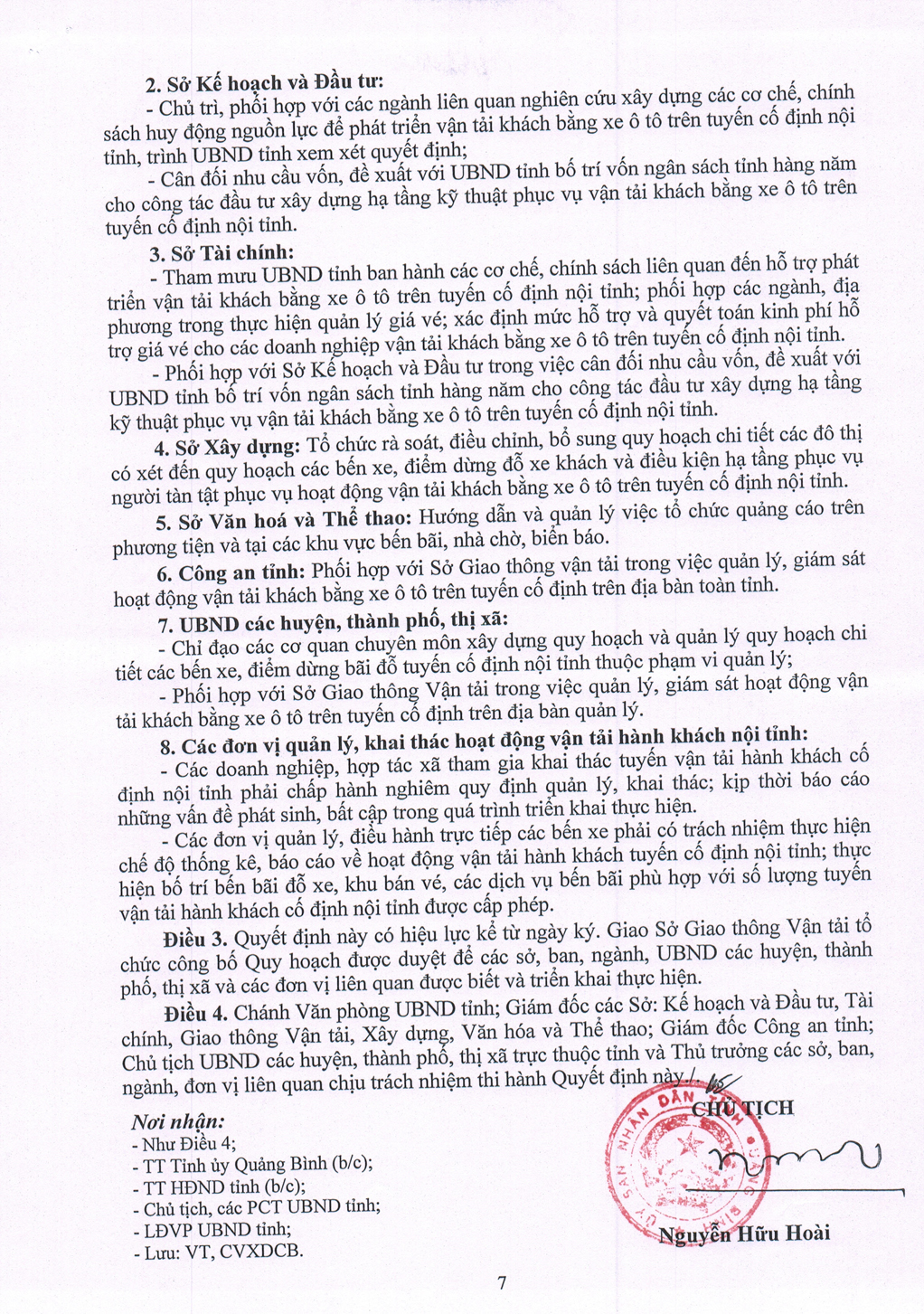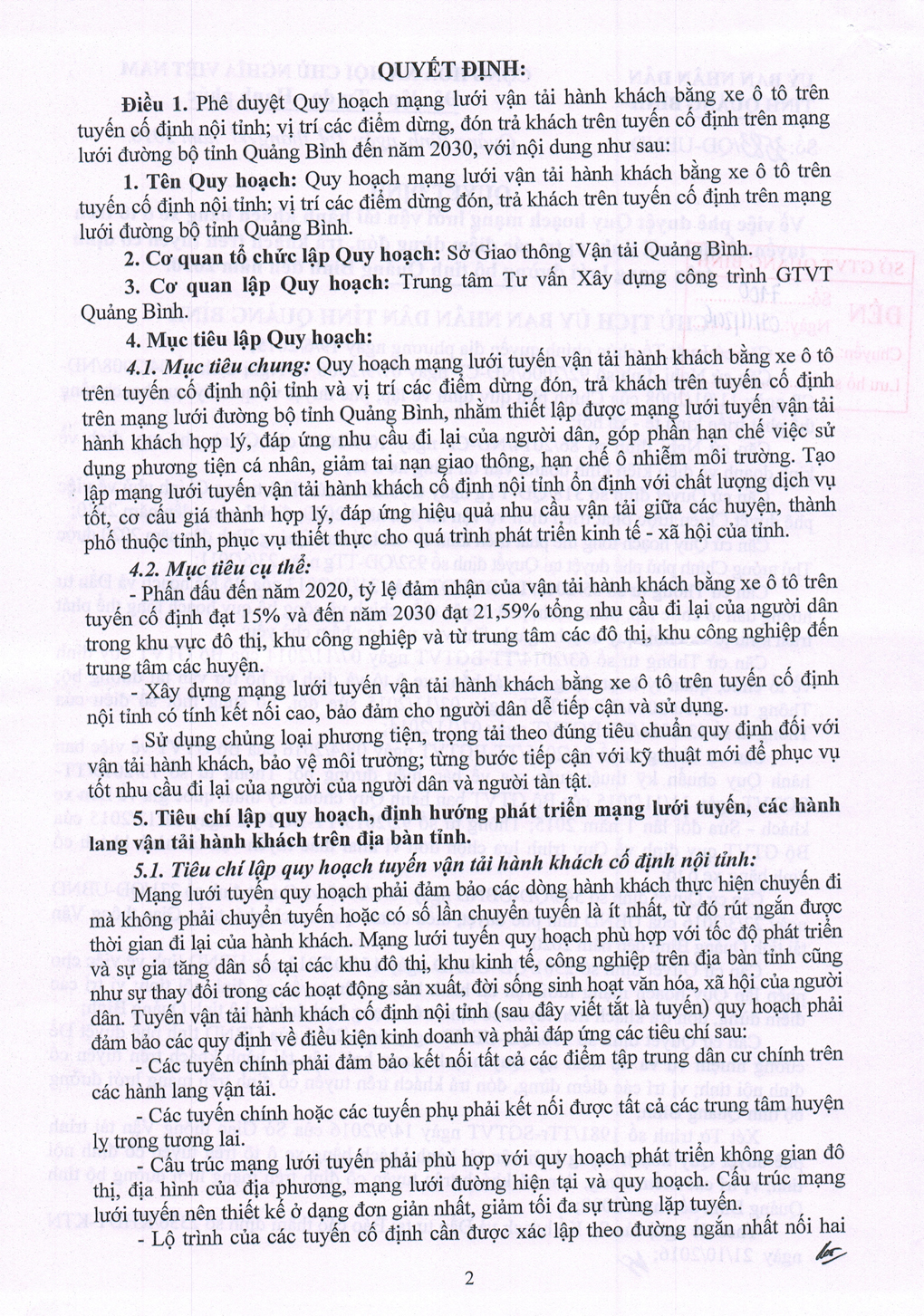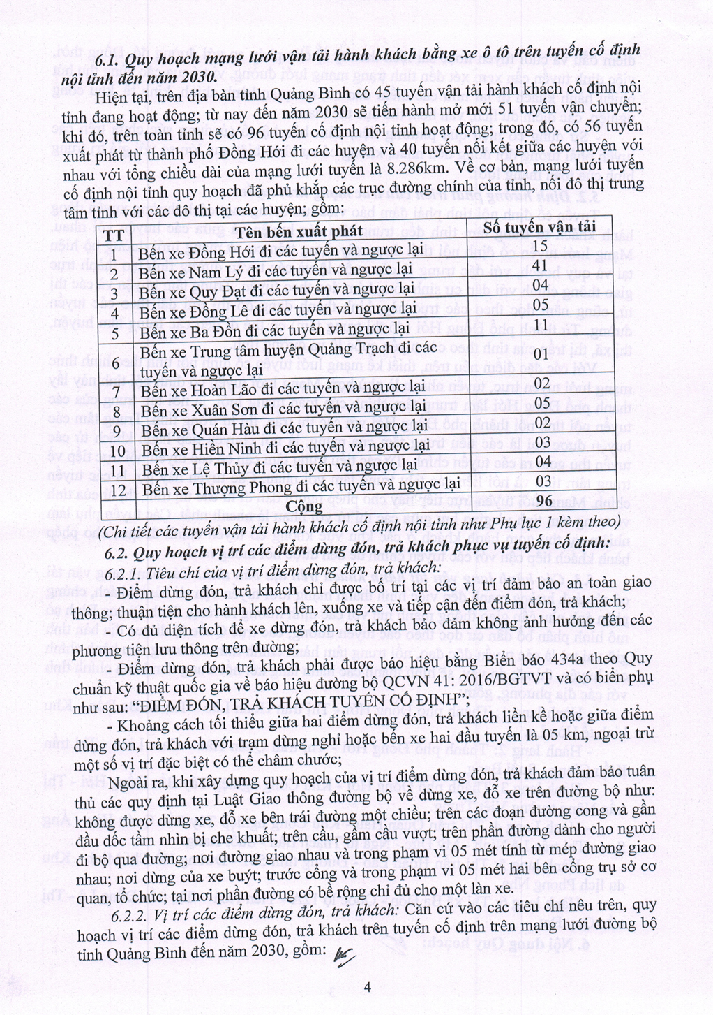 Thông báo Quyết định phê duyệt Quy hoạch mạng lưới vận tải hành khách bằng xe ô tô trên tuyến cố định nội tỉnh; vị trí các điểm dừng đón, trả khách trên tuyến cố định trên mạng lưới đường bộ tỉnh Quảng Bình đến năm 2030.