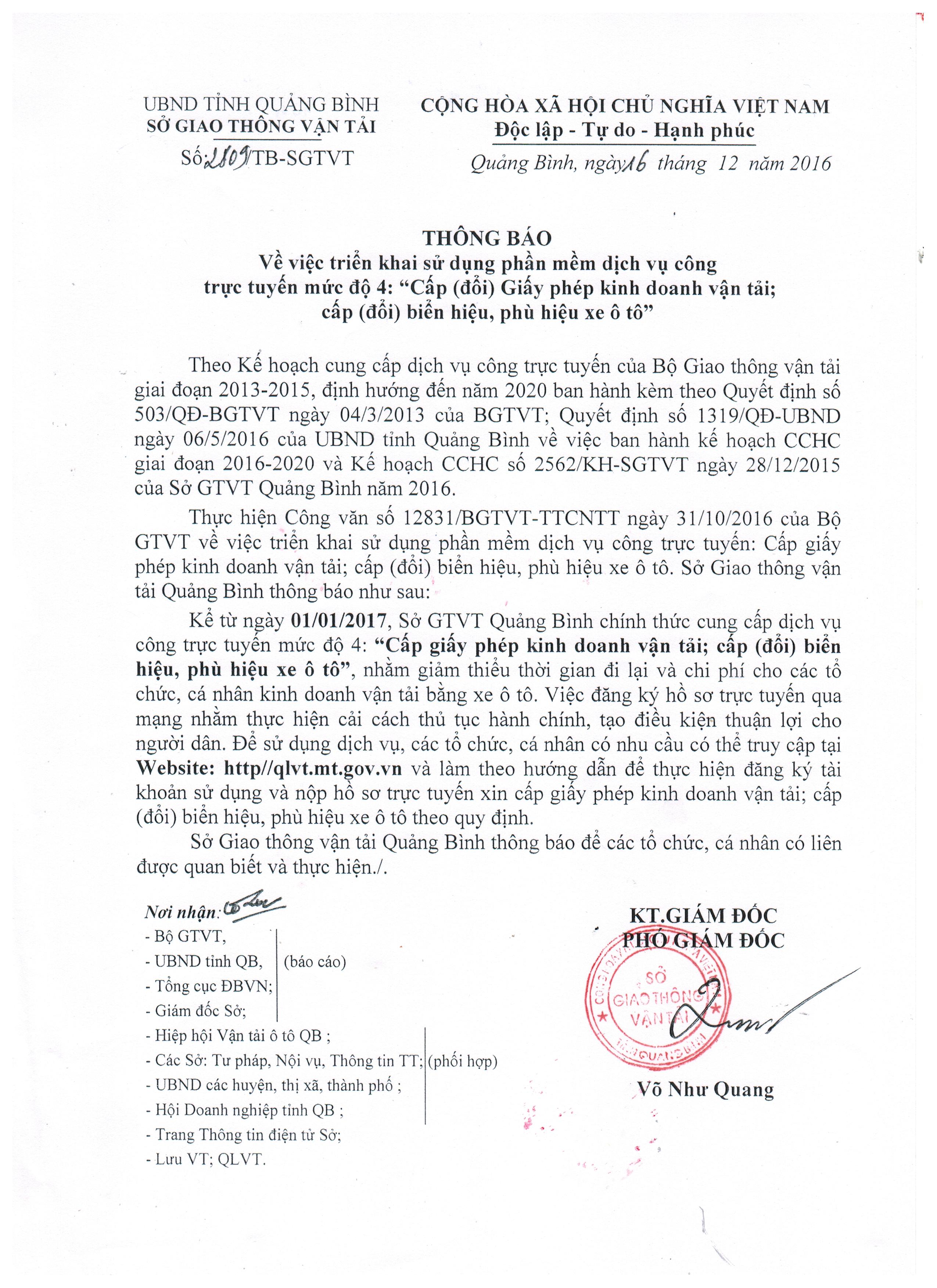 Thông báo Triển khai sử dụng phần mềm dịch vụ công trực tuyến cấp độ 4: "Cấp (đổi) Giấy phép kinh doanh vận tải; cấp (đổi) biển hiệu, phù hiệu xe ô tô"