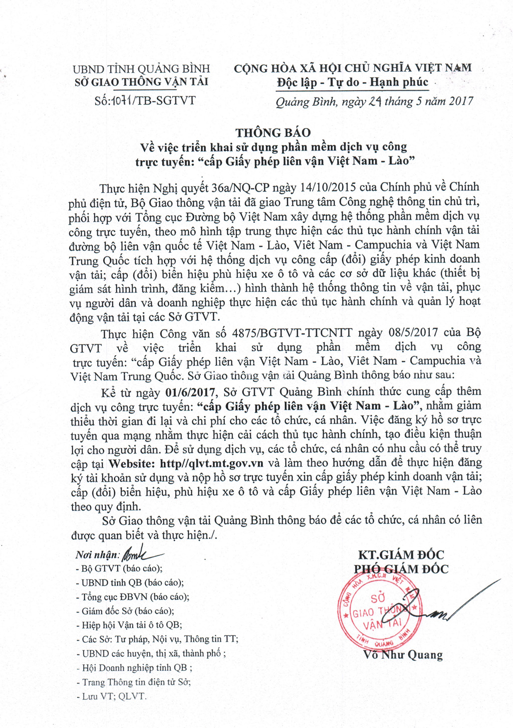 Thông báo về việc triển khai sử dụng phần mềm dịch vụ công trực tuyến "Cấp Giấy phép liên vận Việt Nam - Lào"