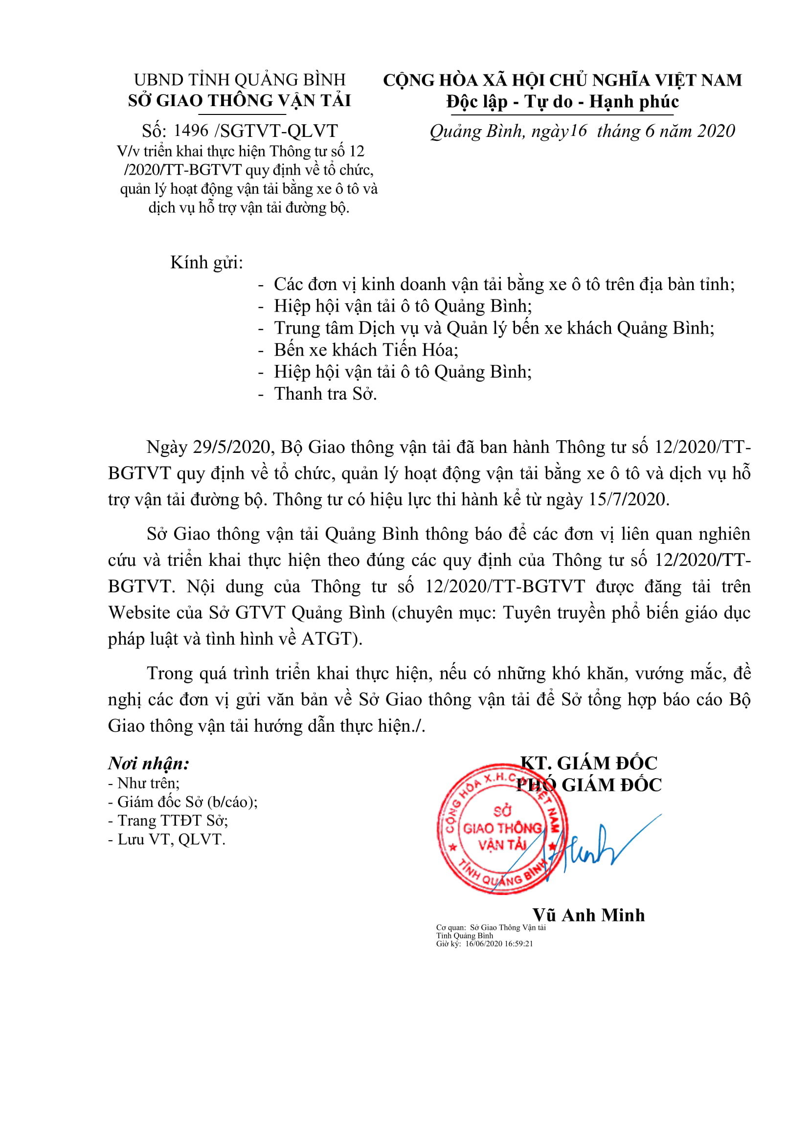 Triển khai thực hiện Thông tư số 12 /2020/TT-BGTVT Quy định về tổ chức, quản lý hoạt động vận tải bằng xe ô tô và dịch vụ hỗ trợ vận tải đường bộ