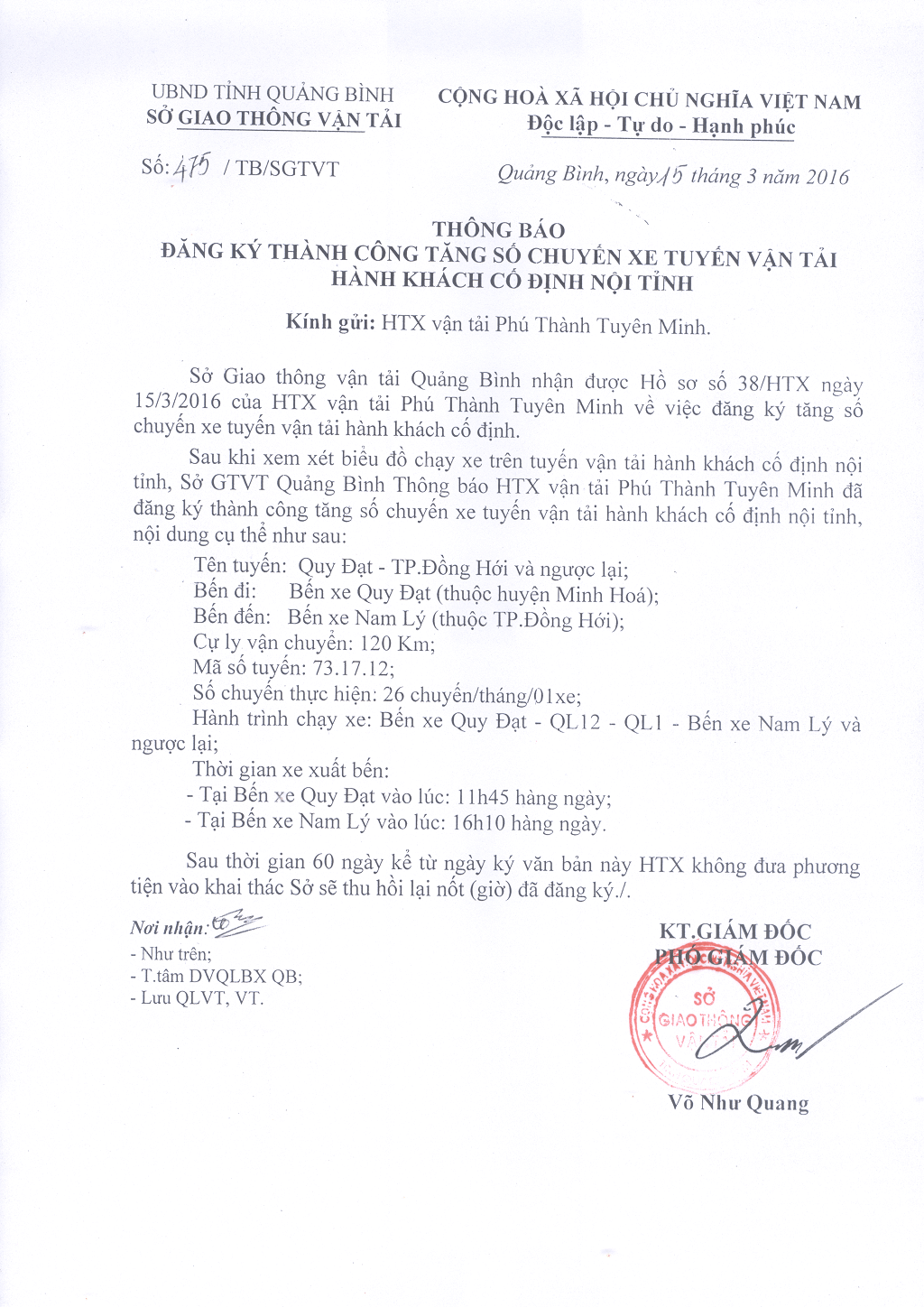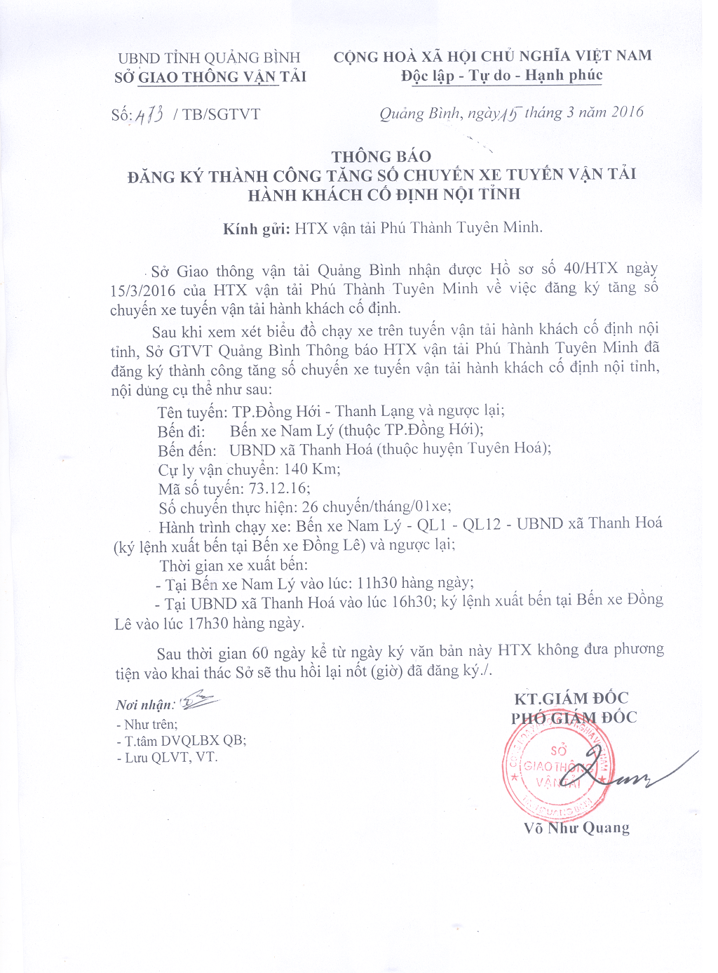 Thông báo Đăng ký thành công tăng số chuyến xe tuyến vận tải hành khách cố định nội tỉnh của HTX vận tải Phú Thành Tuyên Minh