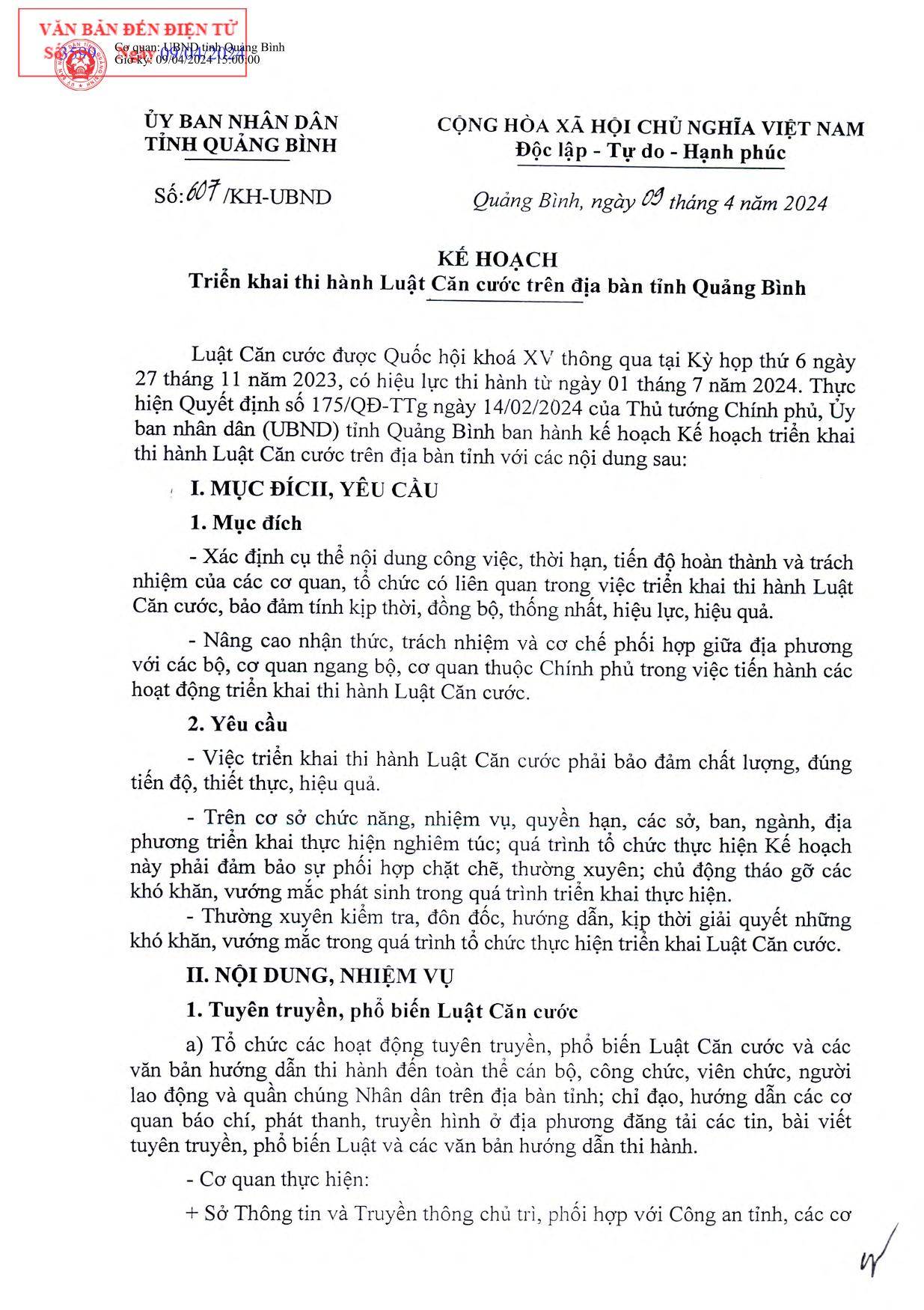 KẾ HOẠCH Triển khai thi hành Luật Căn cước trên địa bàn tỉnh Quảng Bình