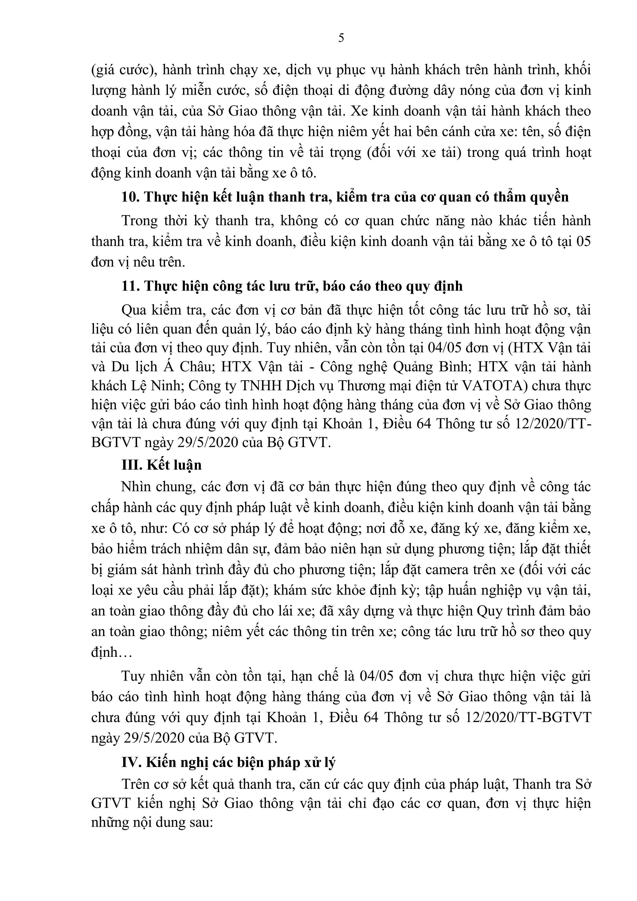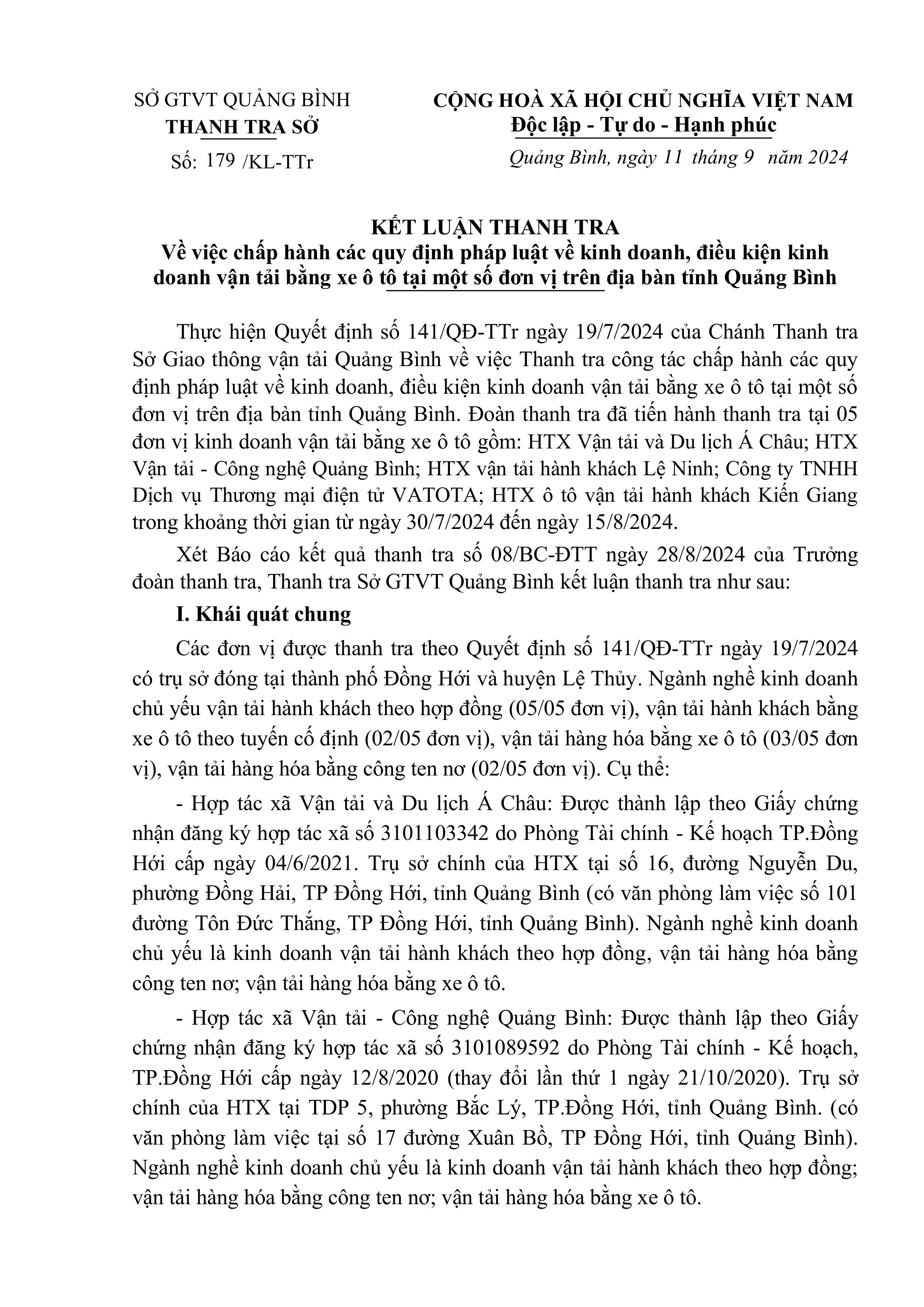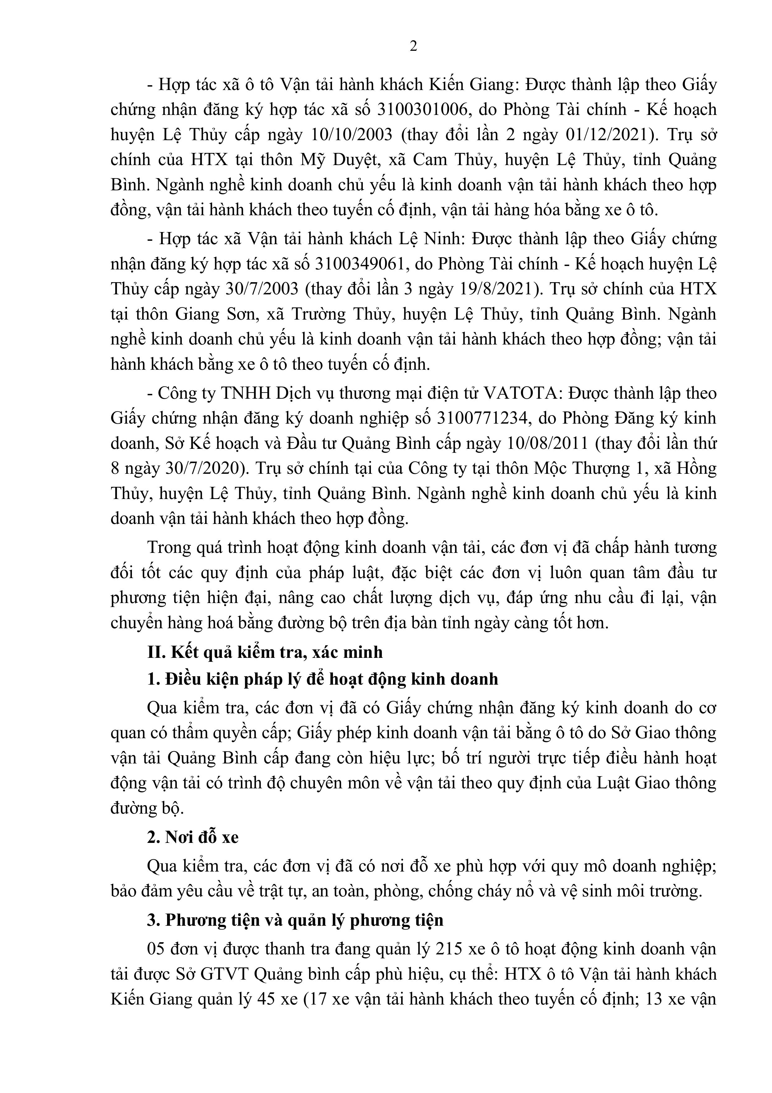 Kết luận thanh tra về việc chấp hành các quy định pháp luật về kinh doanh, điều kiện kinh doanh vận tải bằng xe ô tô tại một số đơn vị trên địa bàn tỉnh Quảng Bình