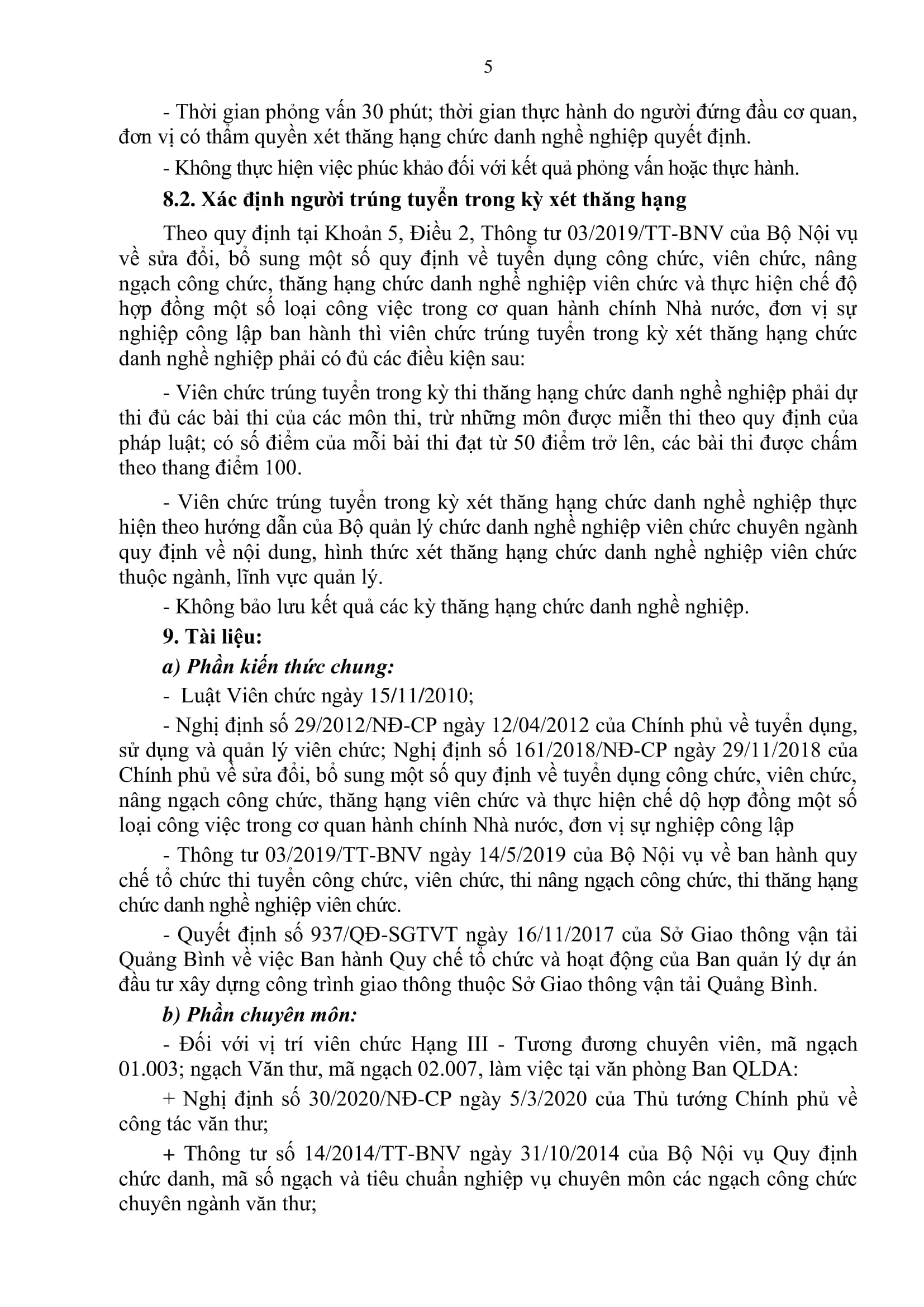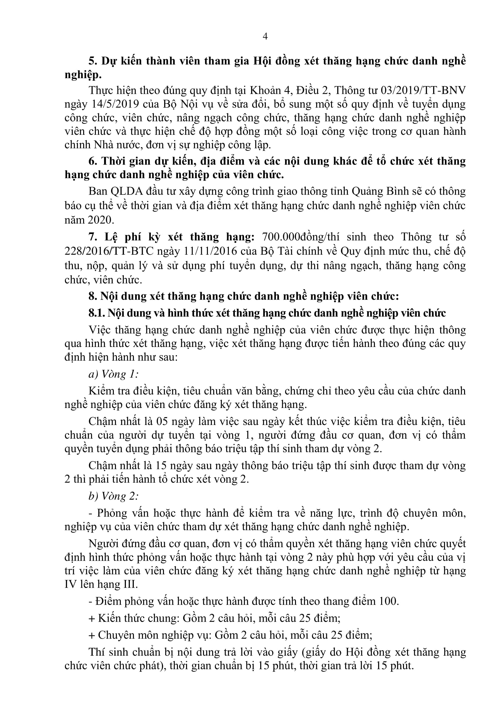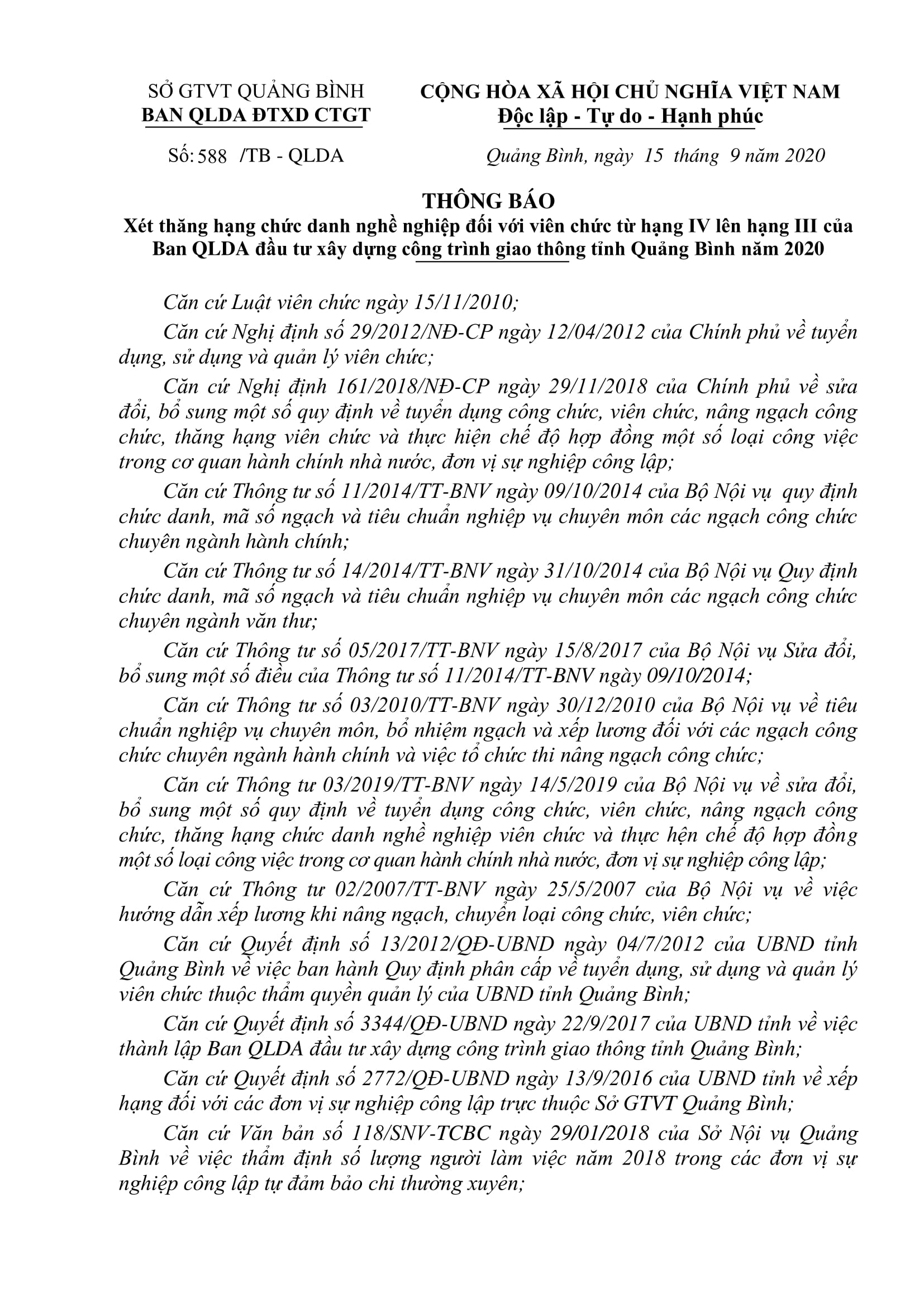 Thông báo Xét thăng hạng chức danh nghề nghiệp đối với viên chức từ hạng IV lên hạng III của Ban QLDA Đầu tư xây dựng công trình giao thông tỉnh Quảng Bình năm 2020