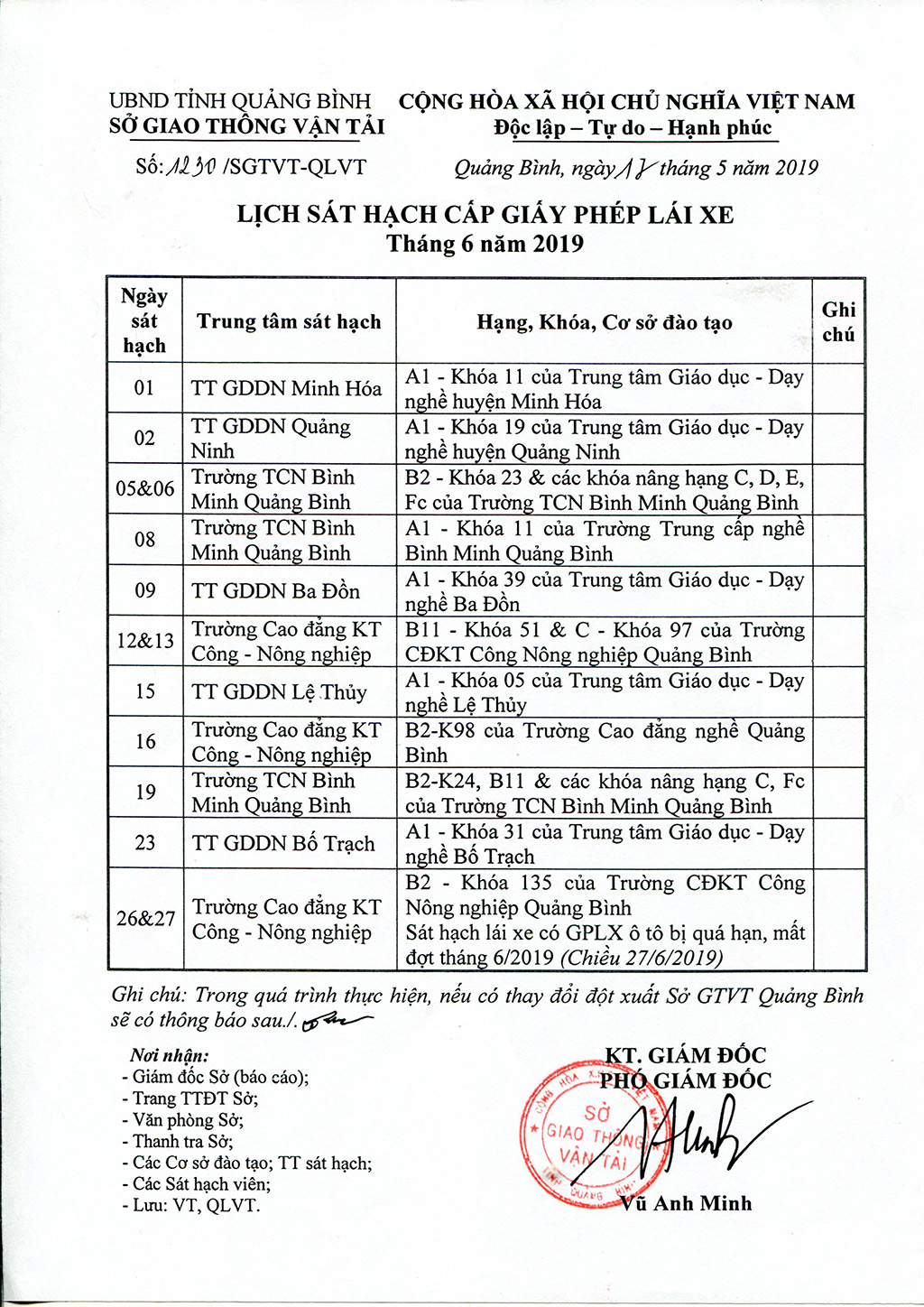 Lịch sát hạch cấp Giấy phép lái xe tháng 06 năm 2019