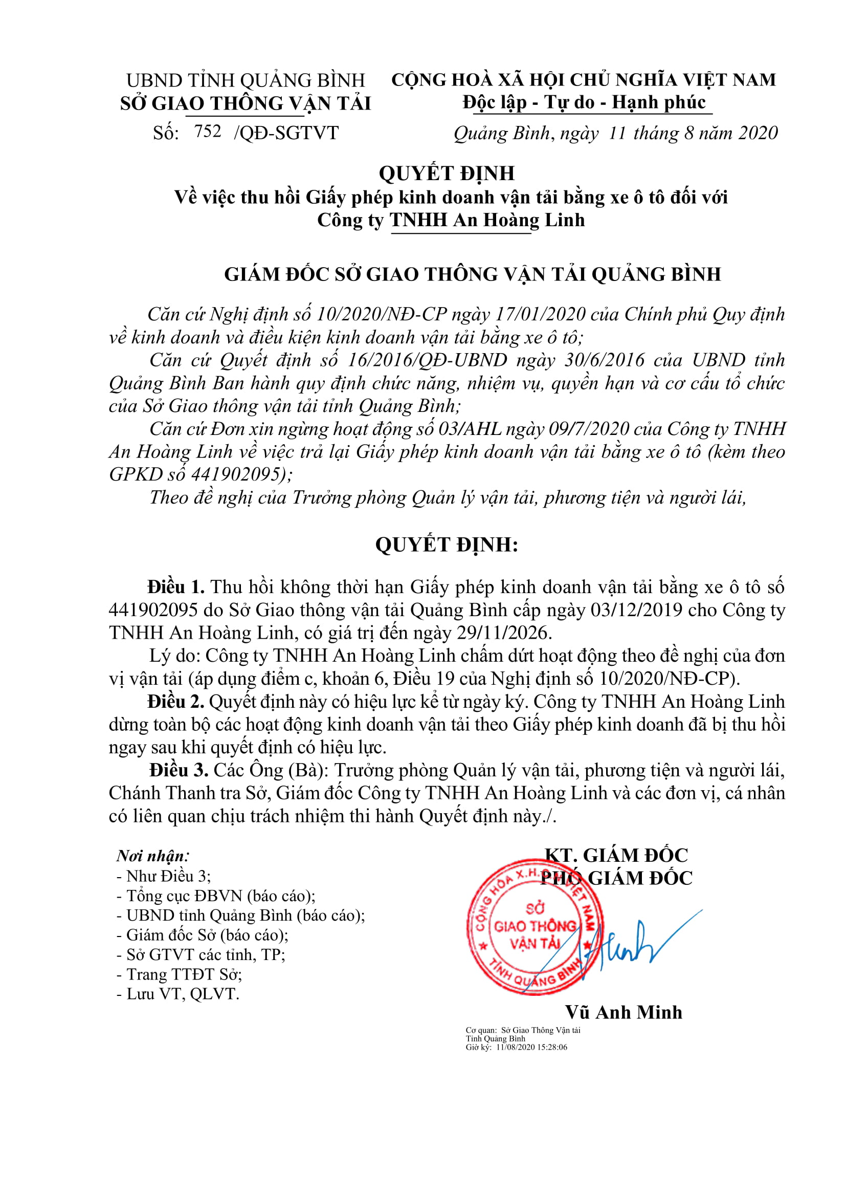 Thông báo thu hồi Giấy phép kinh doanh vận tải bằng xe ô tô đối với Công ty TNHH An Hoàng Linh