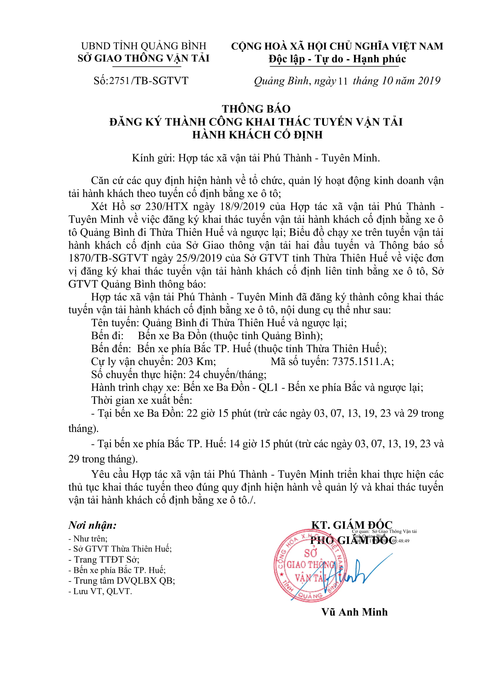 Thông báo Đăng ký thành công khai thác tuyến vận tải hành khách cố định liên tỉnh của Hợp tác xã vận tải Phú Thành Tuyên Minh (tuyến Quảng Bình - Thừa Thiên Huế và ngược lại)