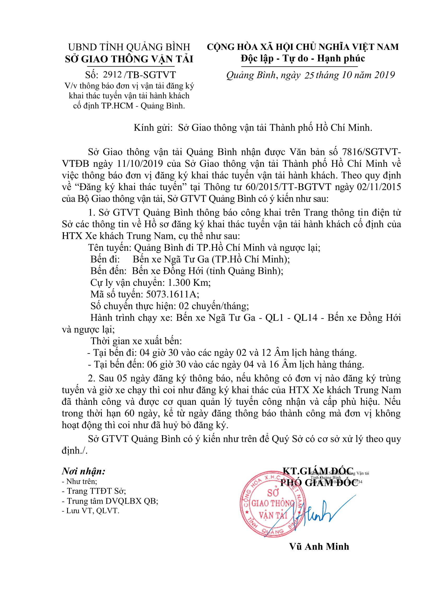 Thông báo Đăng ký khai thác tuyến vận tải hành khách cố định của HTX xe khách Trung Nam (tuyến Quảng Bình - TP. Hồ Chí Minh và ngược lại)