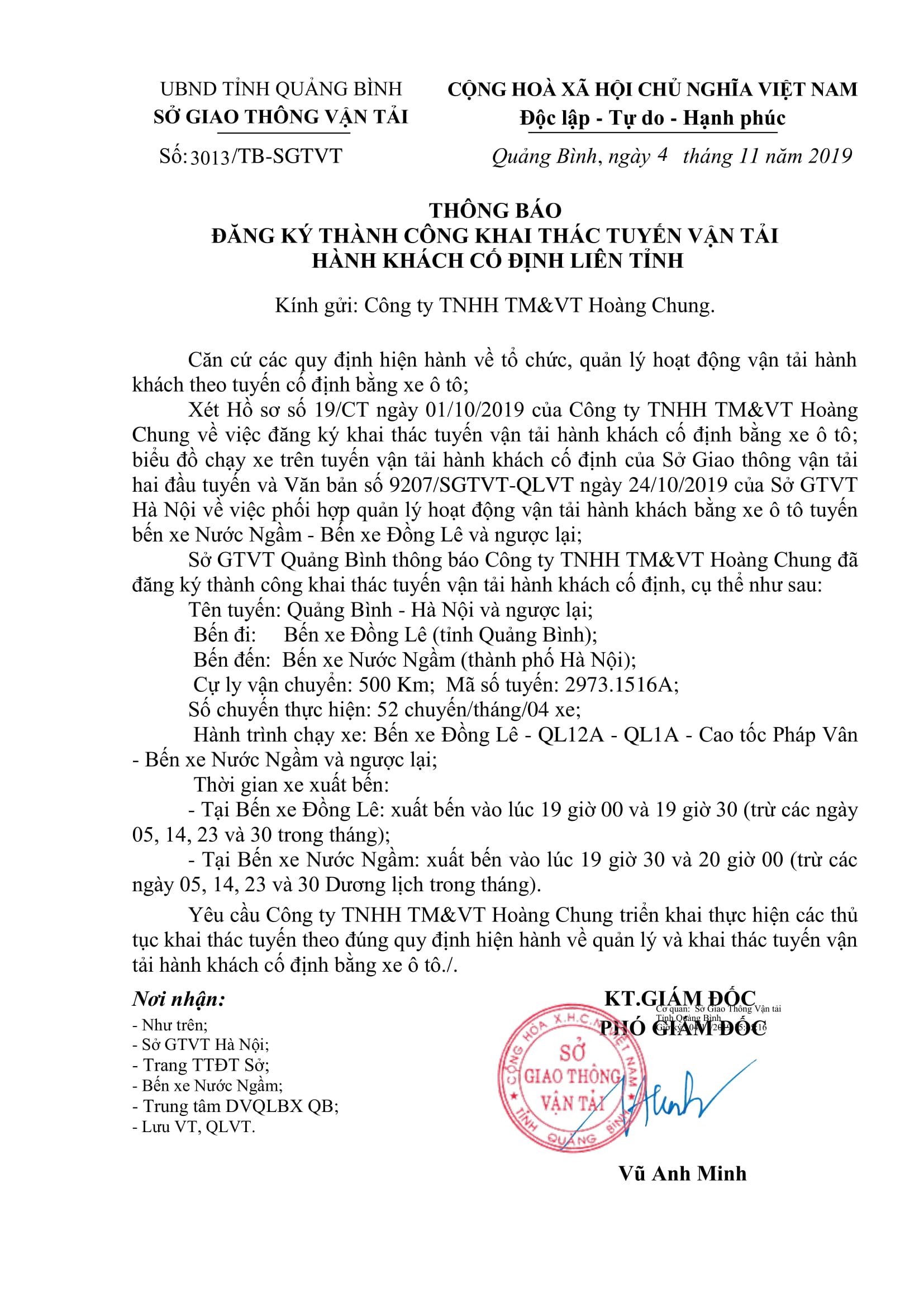 Thông báo Đăng ký khai thác tuyến vận tải hành khách cố định của HTX ô tô vận tải hành khách sông Gianh (tuyến Quảng Bình - Bình Dương và ngược lại)