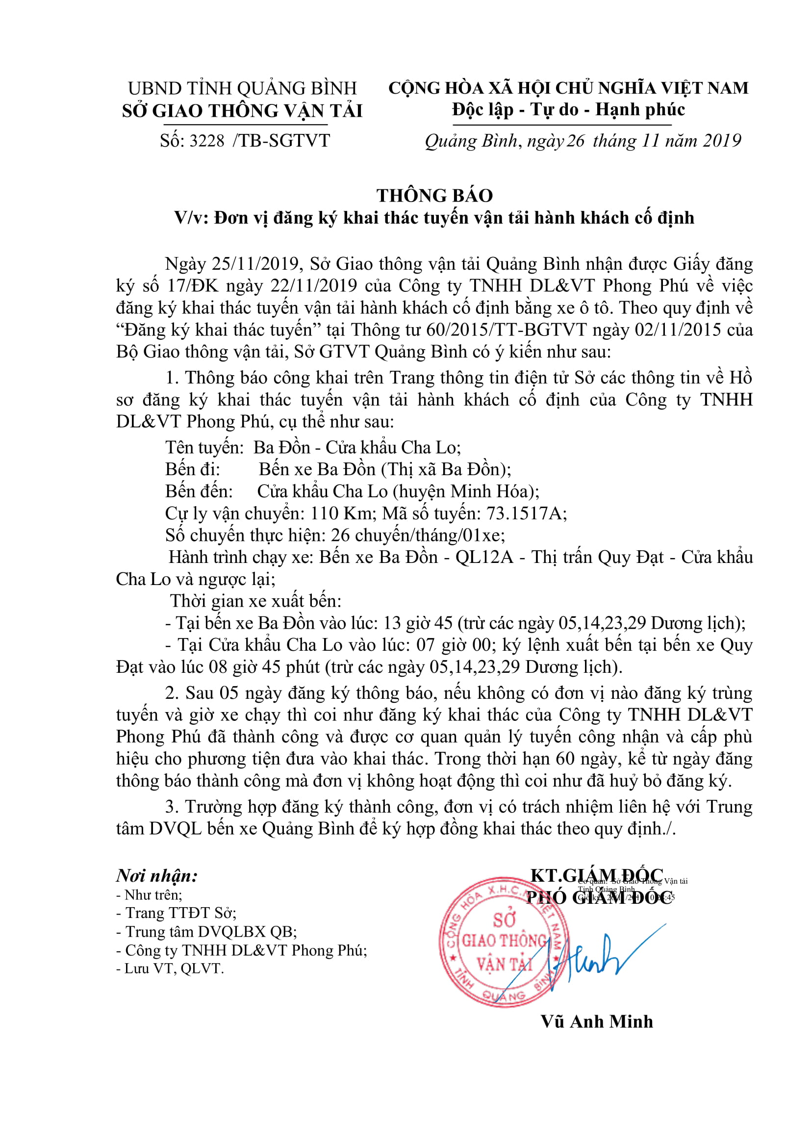 Thông báo Đăng ký khai thác tuyến vận tải hành khách cố định của Công ty TNHH DL&VT Phong Phú (tuyến Ba Đồn - Cửa khẩu Cha Lo và ngược lại)