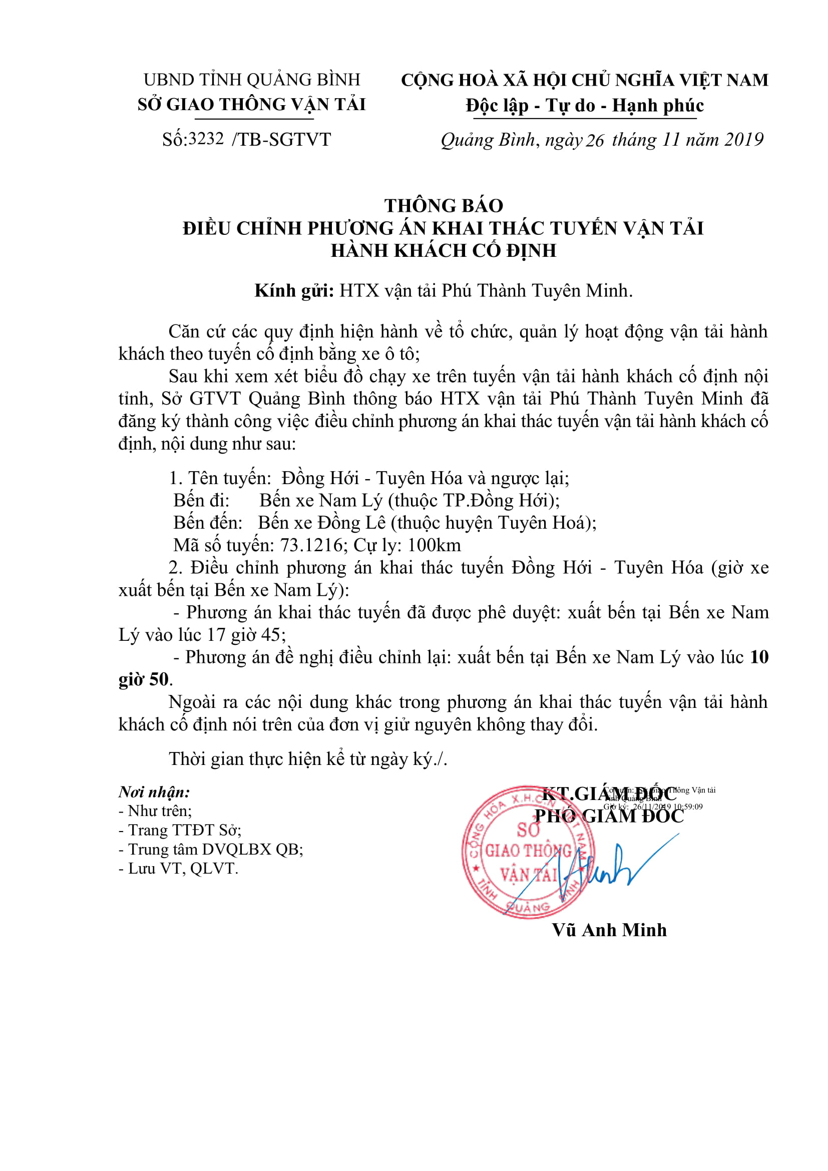 Thông báo Điều chỉnh phương án khai thác tuyến vận tải hành khách cố định của HTX vận tải Phú Thành Tuyên Minh (Tuyến Đồng Hới - Tuyên Hóa và ngược lại)