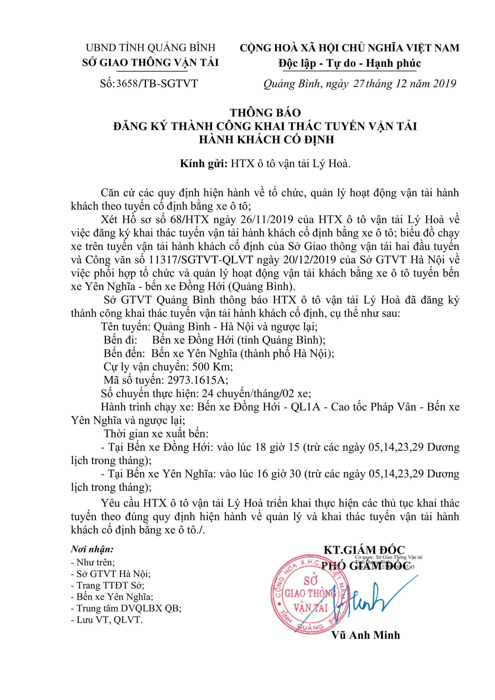 Thông báo Đăng ký thành công khai thác tuyến vận tải hành khách cố định liên tỉnh của HTX ô tô vận tải Lý Hoà (tuyến Quảng Bình - Hà Nội và ngược lại)