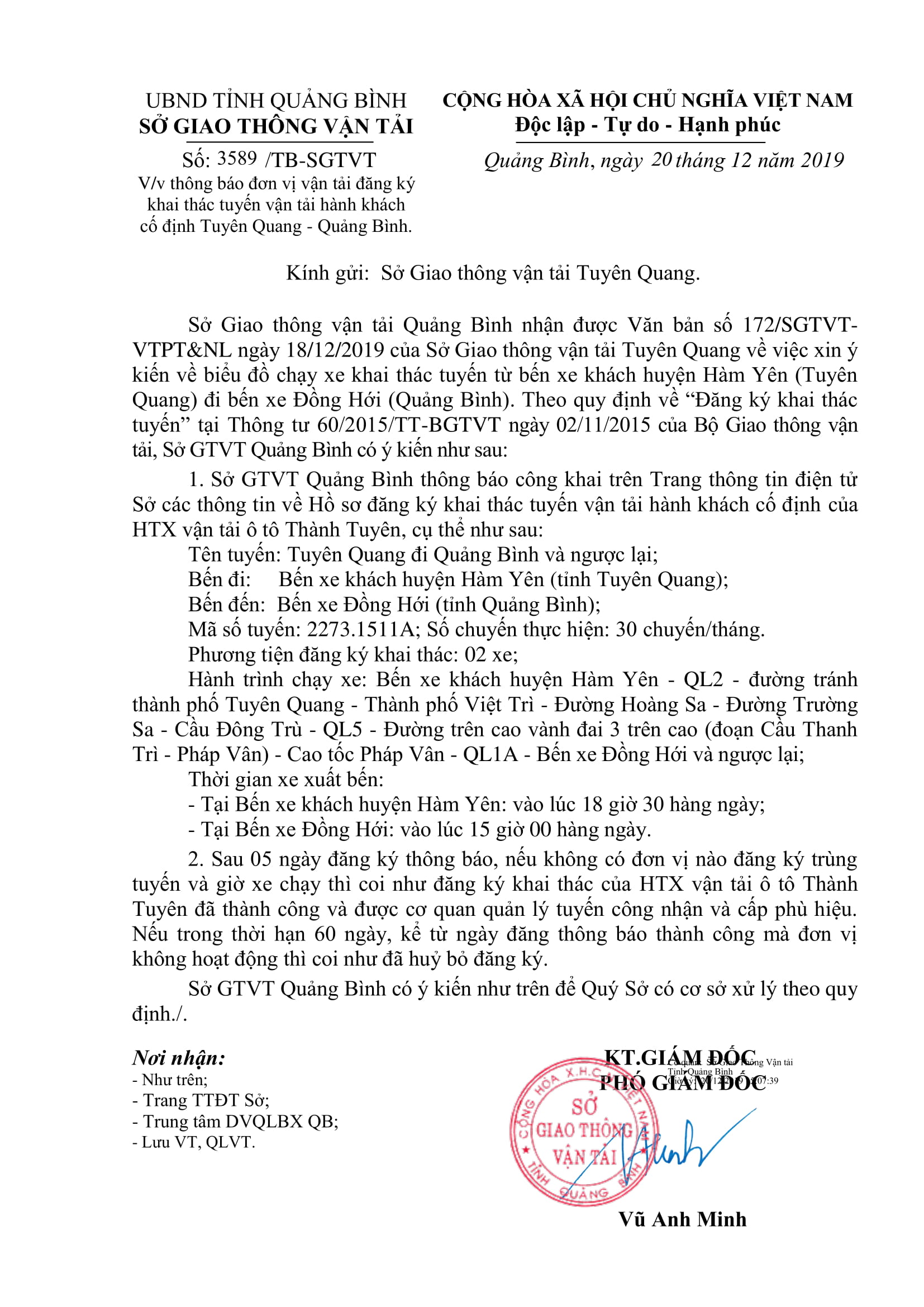 Thông báo Đăng ký khai thác tuyến vận tải hành khách cố định của HTX ô tô vận tải hành khách sông Gianh (tuyến Quảng Bình - Thừa Thiên Huế và ngược lại)