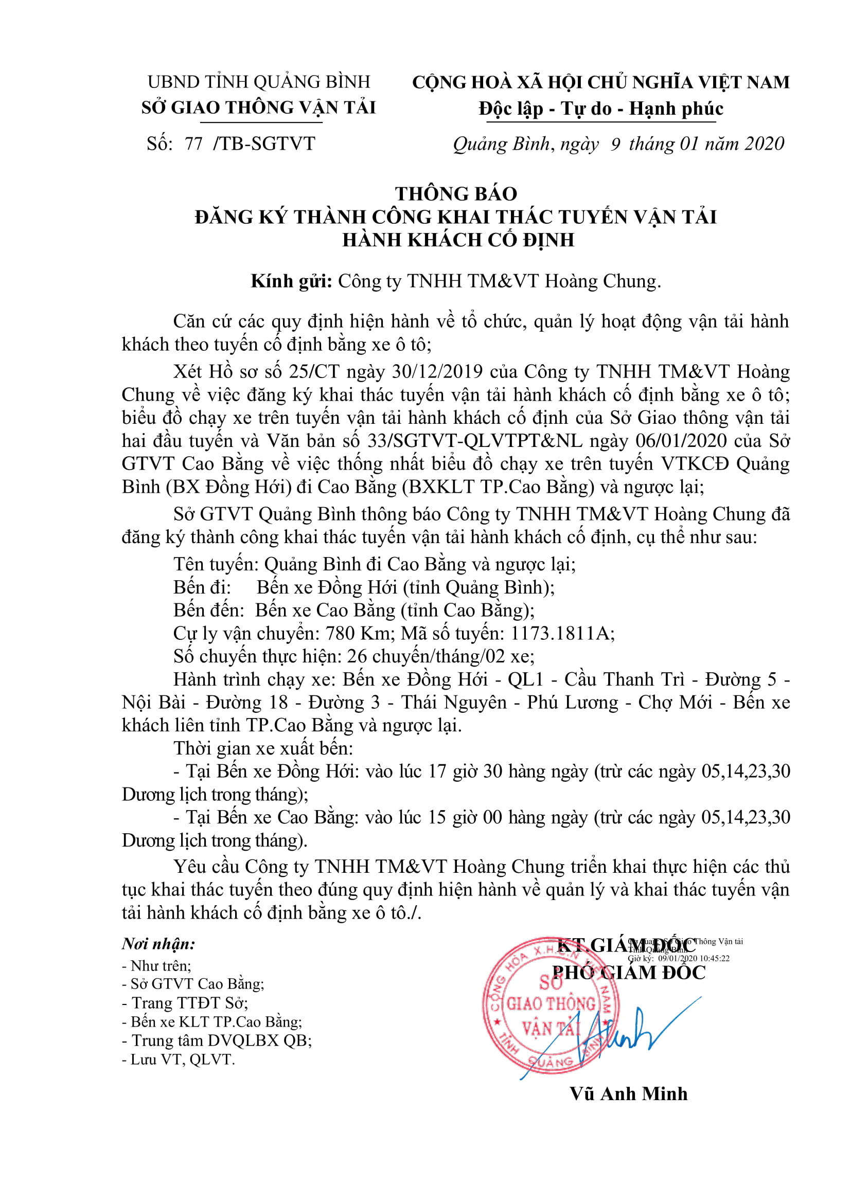- Thông báo Đăng ký khai thác tuyến vận tải hành khách cố định của Công ty TNHH TM&VT Hoàng Chung (tuyến Quảng Bình - Cao Bằng và ngược lại) (30/12/2019)